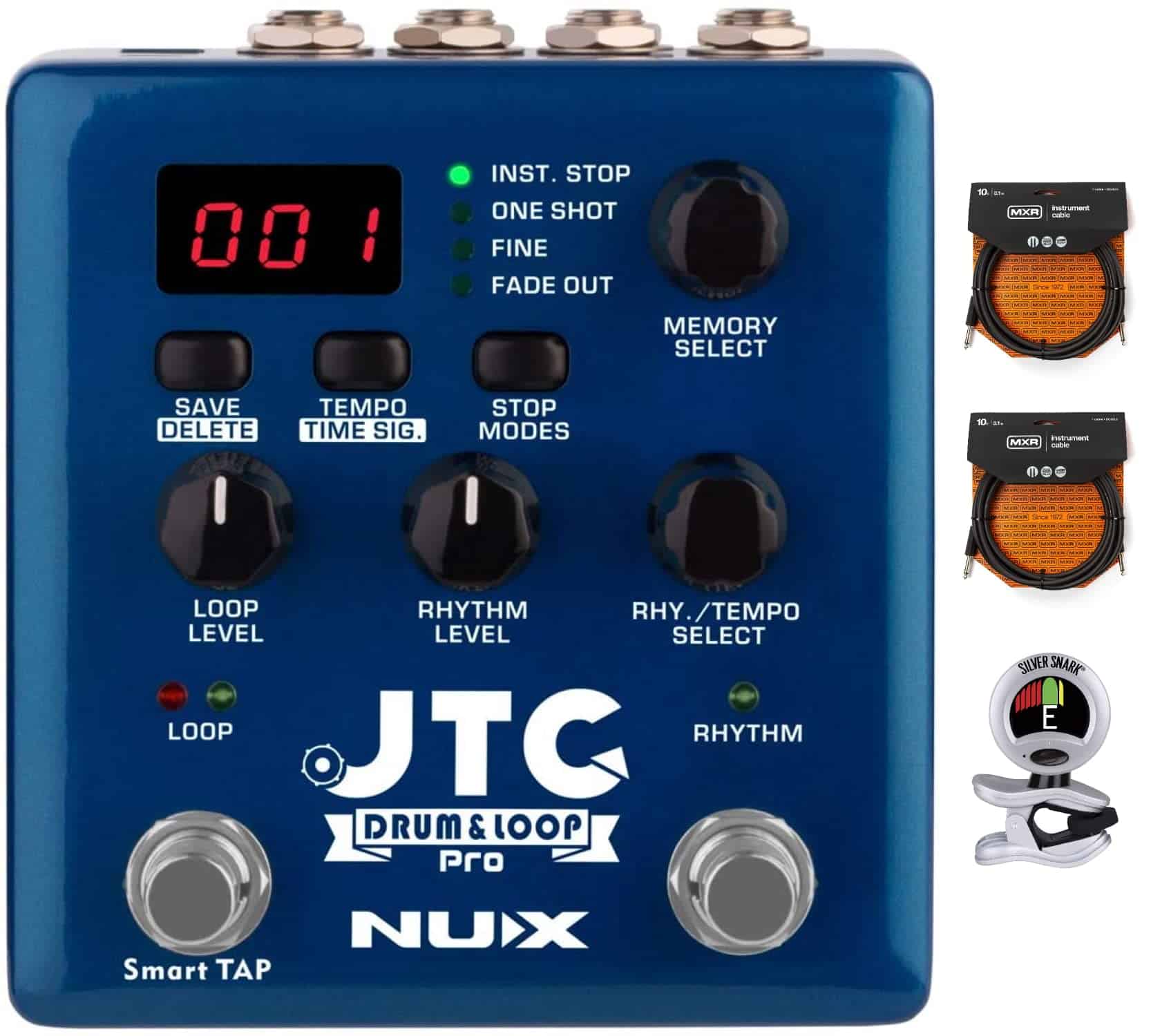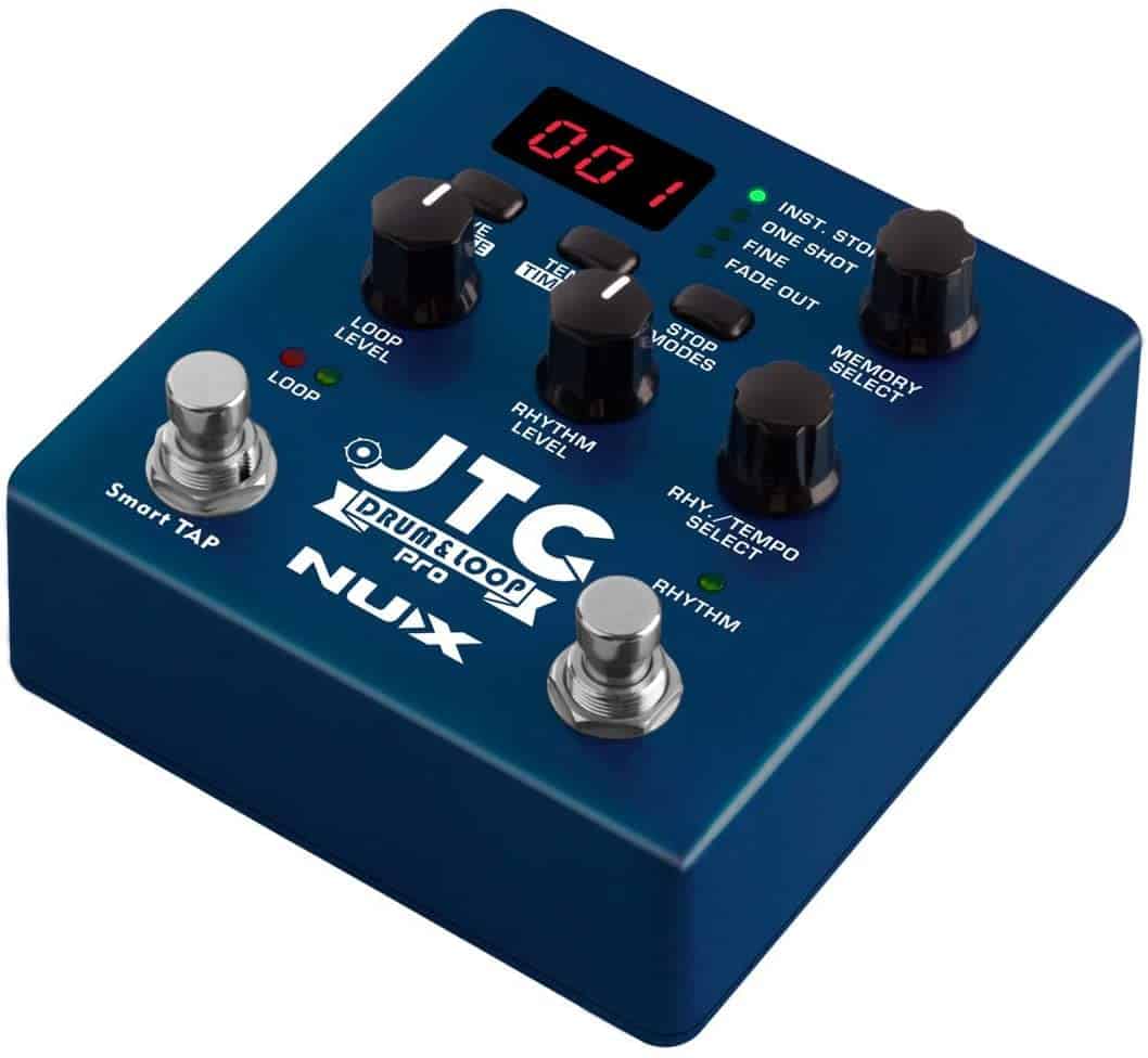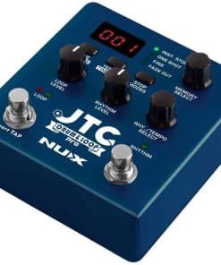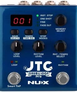 JTC Pro es un pedal avanzado con controles simplificados. Es un pedal de caja de pedales de doble interruptor con capacidad de grabación de 6 horas y 256 memorias de pistas en bucle. Acción de doble interruptor: los controles de bucle y batería están separados, el interruptor de pie izquierdo (LOOP) controla la grabación y sobregrabaciones, y el inicio/parada reproduce las pistas de bucle grabadas. También tiene control de Tempo TAP, puedes establecer la velocidad de la batería golpeando el interruptor de pie izquierdo antes de grabar una pista. 40 Patrones de Batería: 40 patrones de batería y fills que incluyen Pop, Rock, Blues, Metal y más estilos con ritmos de 3/4 y 4/4. Modos de Inicio/Parada: Tiene modos de inicio y parada muy útiles para hacer que tu jam session suene como una canción arreglada durante la actuación. Hay 2 Modos de Inicio y 3 Modos de Parada; Grabación Normal – Acción clásica de grabar y reproducir el looper. Grabación Automática – Pulsar primero el interruptor de pie, JTC Pro se pondrá en espera hasta que pulses las cuerdas de la guitarra. Y comenzará a grabar sin demora cuando toques las primeras notas. Puedes esperar todo el tiempo que quieras, hasta que te sientas listo para tocar. Mantén pulsado el botón de Modos de Parada, y selecciona el modo de inicio; (Ar) Grabación Automática, (Nr) Grabación Normal Modo de UNA SOLA VEZ: Modo de un solo golpe para reproducir cualquier pista de acompañamiento cargada sin hacerla en bucle. Puedes cargar cualquier canción para tocar junto, el tipo de archivo soportado es Wave estéreo de 24 bits 44.1 kHz (.wav). Puedes descargar NUX Audio File Converter para cambiar el formato del archivo. (No procesa la señal de audio, cambia el ID del archivo y JTC Pro puede reconocer el archivo para reproducirlo. El archivo principal debe estar en formato .wav o .mp3, consulta la página de soporte para obtener la guía del convertidor).