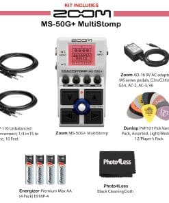 1. BUNDLE INCLUDES: Zoom MS-50G+ MultiStomp, Zoom AD-16 9V AC adapter for MS series pedals, G3n/G3Xn, B3n, G5n, AC-2, AC-3, V6, Cable CPP-110 Unbalanced Interconnect, 1/4 in TS to Same, 10 Feet, Premium Max AA Batteries (4 Pack) E91BP-4, Pick Variety Pack, Cleaning Cloth.