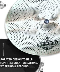 1. Claridad y dinámicas incomparables. A diferencia de los platillos de baja volumen típicos que a menudo suenan apagados o opacos, nuestro paquete utiliza patrones de perforación avanzados y una aleación premium para mantener el brillo natural y la sostenibilidad de los platillos tradicionales, pero a un volumen reducido. Esto significa que los bateristas pueden practicar con calidad de sonido realista y expresión matizada, creando una experiencia inmersiva sin molestar a los demás. 2. Paquete de Platillos de Baja Volumen Rhythm Bytes. Este juego de 5 platillos diseñado para prácticas silenciosas incluye hi-hats de 14″, crash rápido de 16″, crash profundo de 18″ y ride de 20″, toca platillos silenciosos con la sensación de platillos reales. 3. Sensación y respuesta natural en bajo volumen. Los platillos silenciosos Rhythm Bytes ofrecen un excelente rebote y respuesta familiar, para que los bateristas puedan mantener la precisión mientras reducen el ruido, una solución perfecta para prácticas silenciosas efectivas. 4. Volumen reducido con sonido claro. Diseñado para producir tonos claros y equilibrados a un volumen bajo, el juego de platillos Rhythm Bytes te permite perfeccionar la técnica sin abrumar tu espacio con sonido. 5. Ideal para estudios y salas de ensayo. Excelente para estudios caseros, escuelas de música y ensayos, los platillos de baja volumen Rhythm Bytes son perfectos para entornos que necesitan sonidos más silenciosos manteniendo la calidad de la interpretación intacta. 6. Regalo atento para bateristas. Este paquete de platillos de baja volumen es un excelente regalo, regalo de vacaciones o de Navidad para bateristas de cualquier nivel de habilidad, permitiéndoles practicar con platillos silenciosos que no interrumpen su entorno. 7. Juego de platillos portátil y conveniente para prácticas. Ligero y fácil de transportar, este juego de platillos Rhythm Bytes es ideal para prácticas sobre la marcha, ya sea en casa o en un espacio de ensayo.