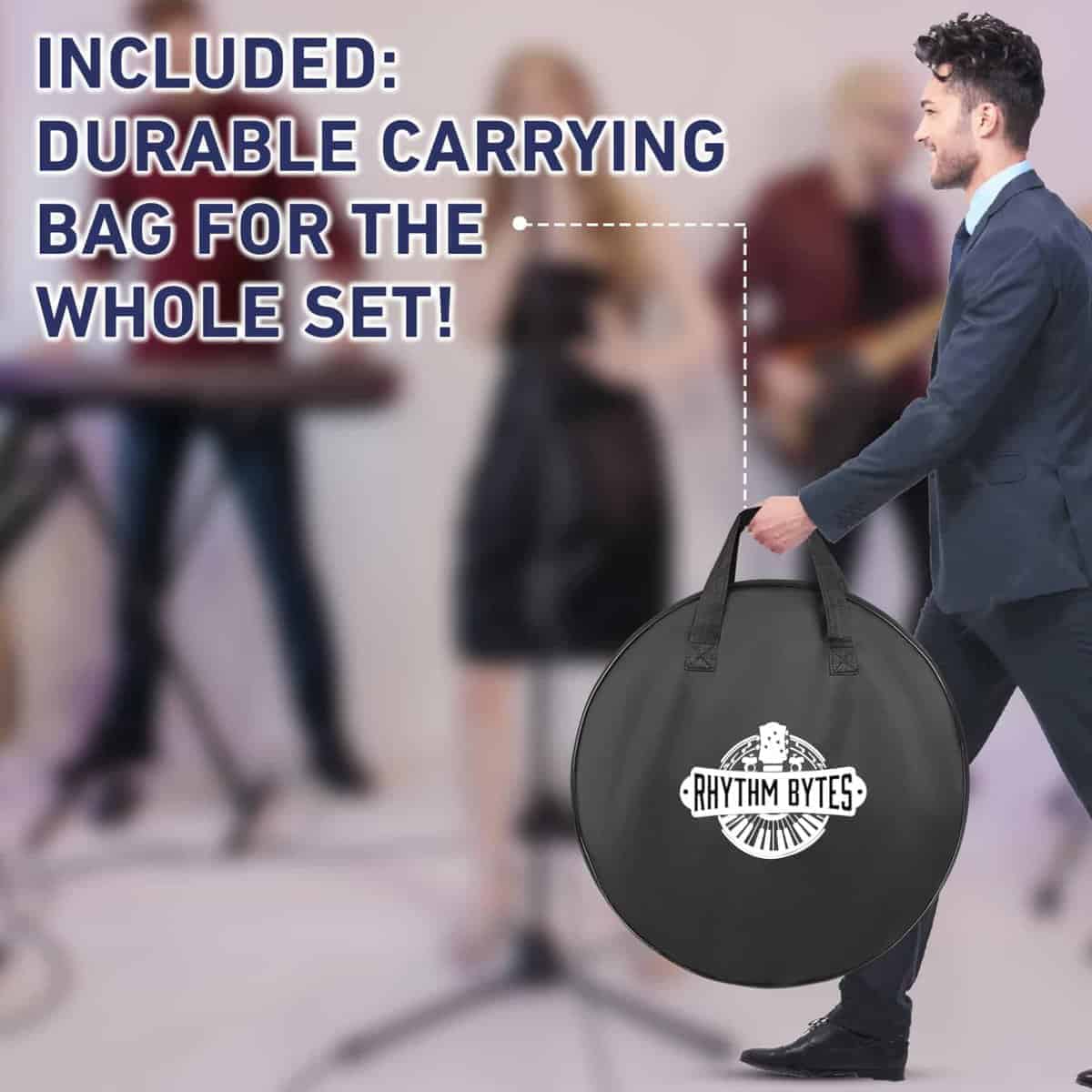 5. Práctica en cualquier lugar – El paquete incluye un estuche de platillos de calidad premium con asas. Esto te permite llevar cómodamente tu pack de platillos, almohadillas de apagador de cabezales de batería, baquetas y otros accesorios de batería a estudios y ensayos.