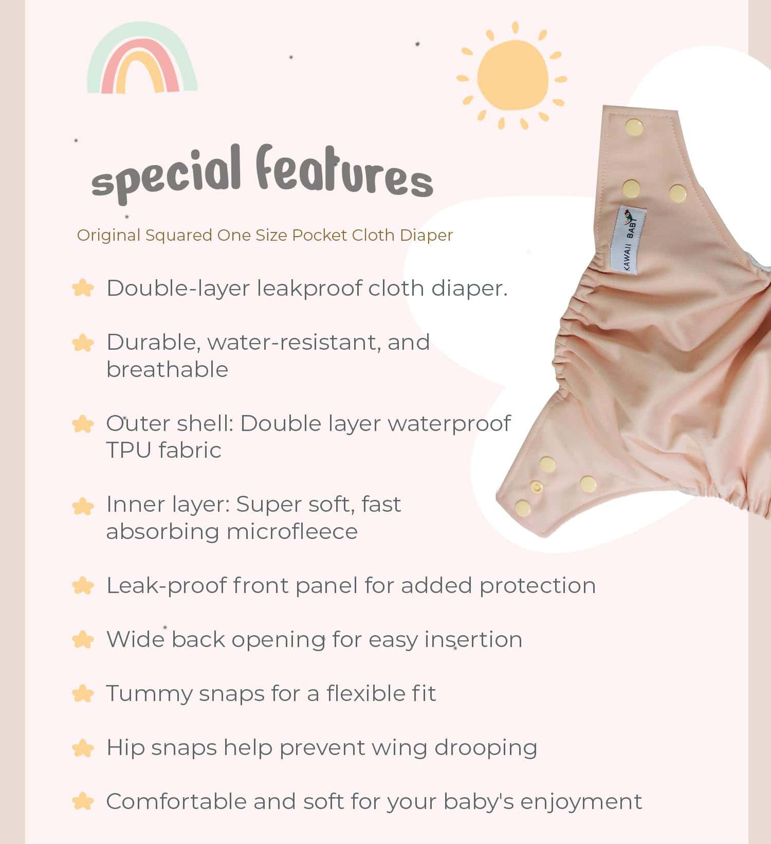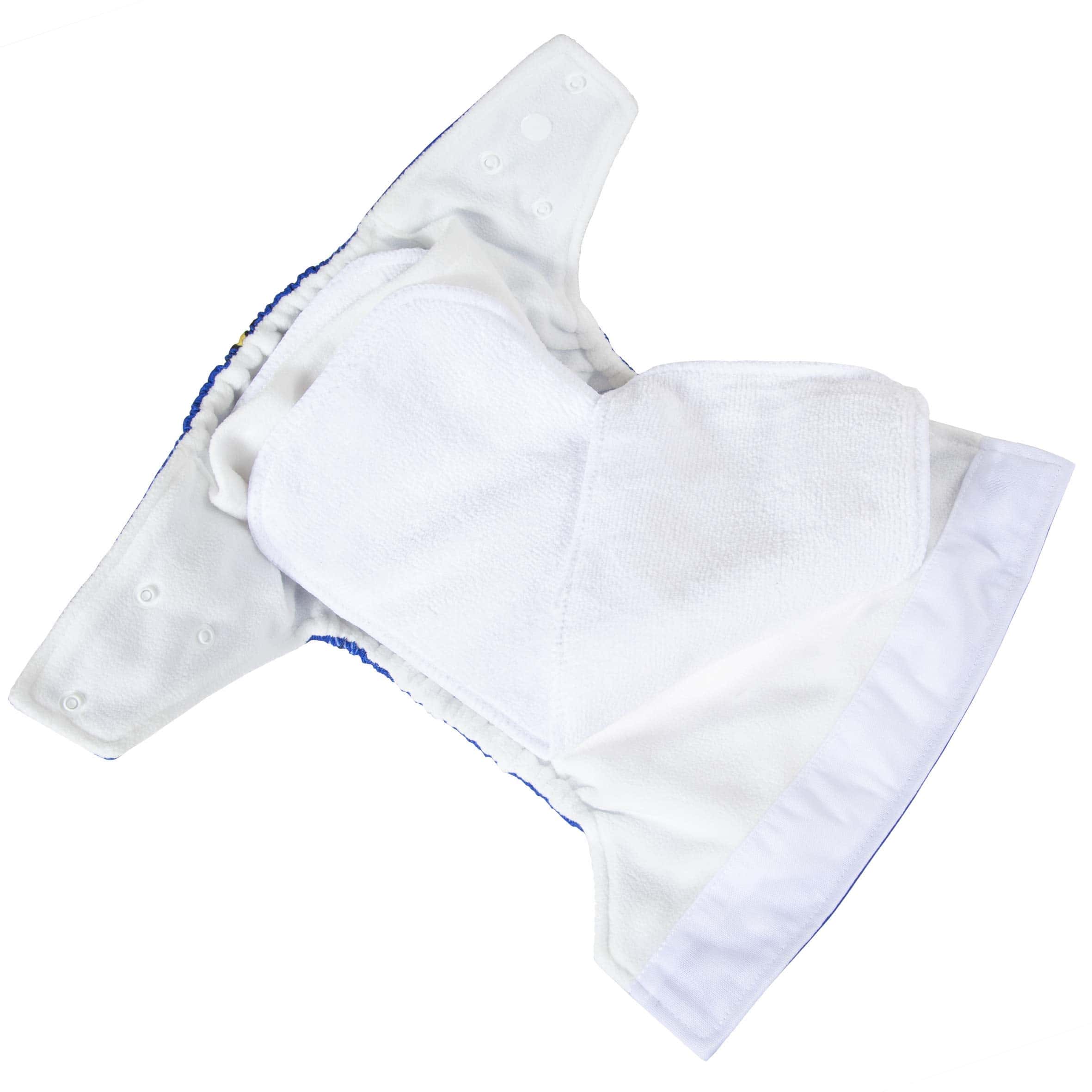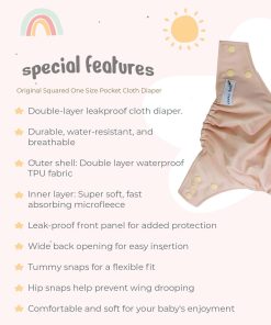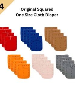 Impermeable, duradera y de calidad premium. Enviaremos surtido de colores. La Original Cuadrada mejorada tiene una cubierta exterior impermeable de doble capa premium, altamente resistente al agua pero también permeable al aire. Duradera, reduce los riesgos de separación de membranas en comparación con los materiales impermeables tradicionales. Este sistema de pañales de tela de dos partes consta de 2 partes, adecuadas para bebés de 8 a 36 libras: Cubierta exterior impermeable Dos grandes inserciones de microfibra La cubierta tiene una abertura de bolsillo ubicada en la capa interior para acomodar las inserciones de microfibra. Una vez relleno, es como un (AIO) Pañal Todo en Uno. La cubierta exterior también se puede usar como cubierta de pañales sobre tus pañales prefold o ajustados favoritos. Capa interna de microfelpa súper suave, la humedad se absorberá rápidamente hacia las inserciones. ¡A tu bebé le encantará la suavidad! Insertos de Microfibra Respetuosos con el Medio Ambiente Los insertos (o almohadillas absorbentes) están hechos de microfibra sin blanquear al 100%. El material tiene muchas hebras diminutas y es respetuoso con el medio ambiente. Tiene una superficie 40 veces más absorbente que el algodón y es menos voluminoso. Son suaves y fáciles de limpiar. Incluimos 2 grandes inserciones absorbentes de microfibra en cada pañal – una para el día y la segunda para la noche o para los bebés con mucha orina. Características: Amplia abertura de bolsillo para introducir fácilmente Cierres de cadera – Evitan que las alas se caigan Panel frontal – Previenen fugas para bebés que duermen boca abajo.