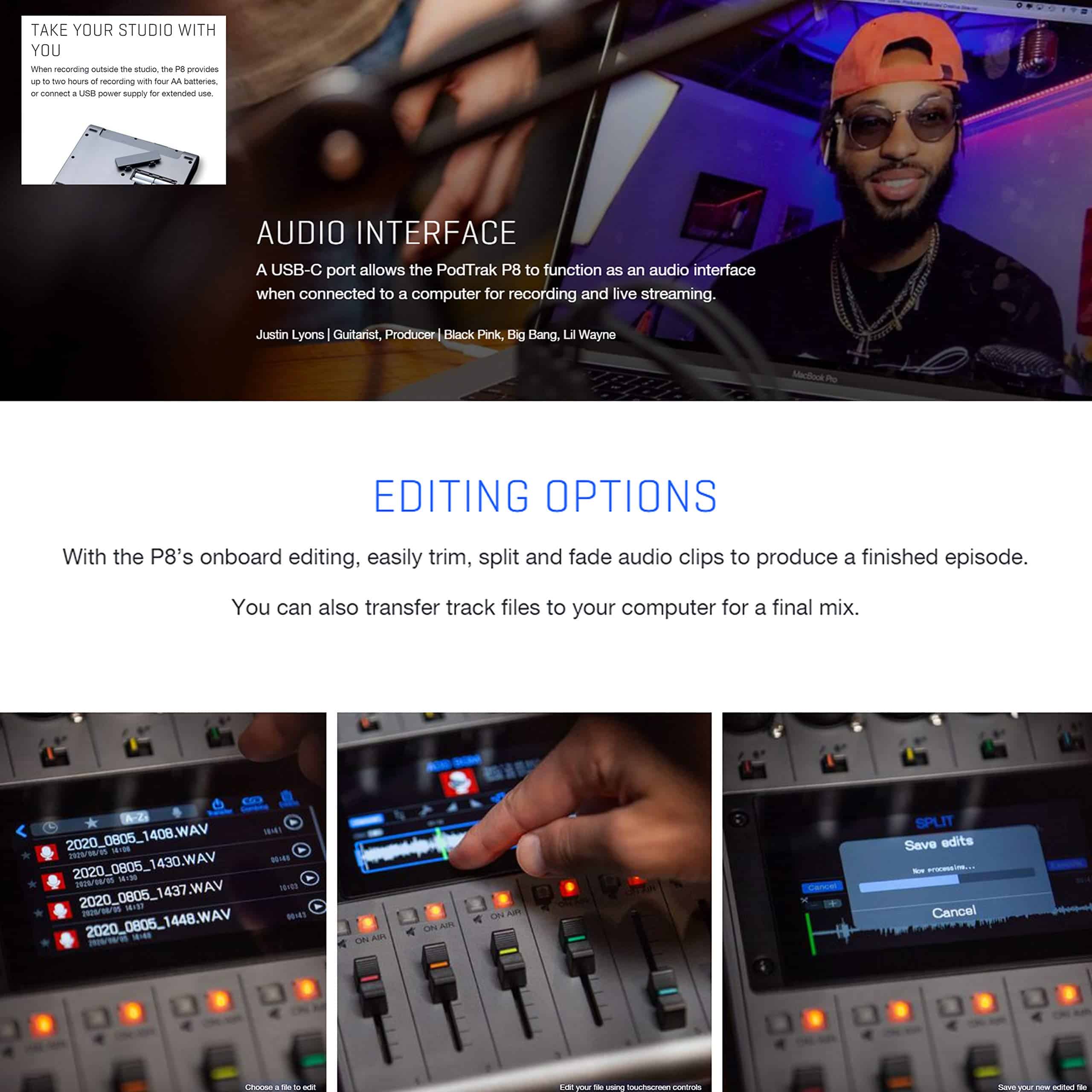El Zoom PodTrak P8 es fácil de usar y puede manejar los podcasts más ambiciosos. Con todas las funciones que necesita para grabar, editar y mezclar, el PodTrak P8 es su estudio de podcast completo. El Zoom PodTrak P8 es una grabadora portátil multitrack de podcast que le permite grabar rápidamente hasta seis micrófonos, manejar 2 llamadas remotas sin eco simultáneamente, disparar muestras de sonido y proporcionar alimentaciones de auriculares separadas para todos sus invitados, todo al mismo tiempo y con una simplicidad refrescante, gracias a la gran pantalla táctil LCD a color. Desde los controles intuitivos y táctiles hasta las potentes funciones de procesamiento y edición de audio, el PodTrak P8 está bien equipado para ayudarlo a grabar, transmitir y exportar audio prístino para podcasts de panel complejos. Micrófonos dinámicos y de condensador, almohadillas de sonido personalizables, llamadas a través de su teléfono inteligente o computadora y salidas de auriculares independientes; el PodTrak P8 puede manejar todo lo que necesita que haga una estación de producción de podcast. En la caja: Adaptador de corriente alterna Zoom AD-14 Garantía limitada de 1 año Incluye: Grabadora de Podcast Zoom PodTrak P8 4x Micrófono de Podcast Zoom ZDM-1 Adaptador Bluetooth Zoom BTA-2 4x Auriculares 4x Soporte de Mesa 4x Pantallas Antiviento Cable XLR Paño de limpieza negro de Photo4Less