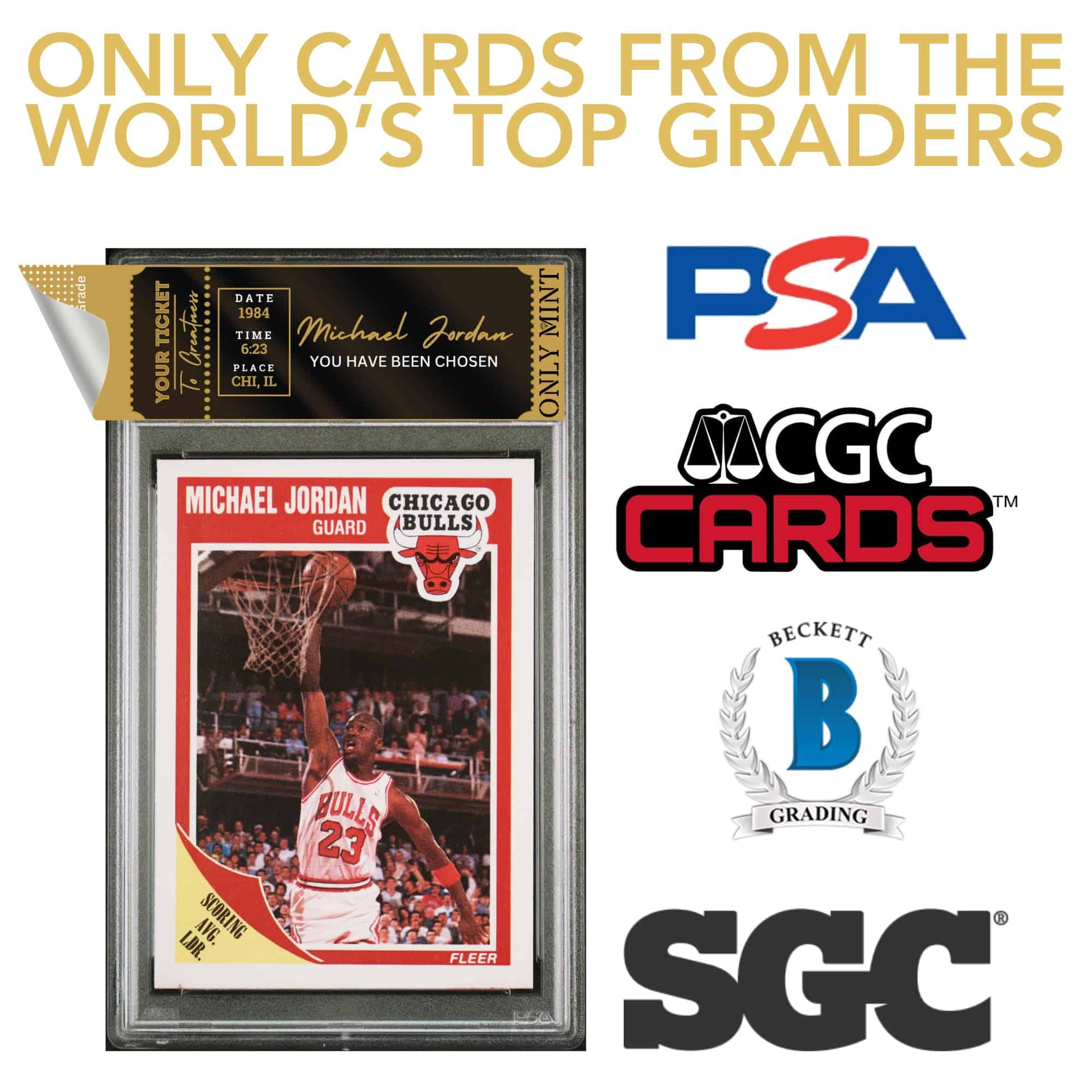 ¡Vengan todos los entusiastas de las tarjetas de baloncesto y coleccionistas de artículos deportivos! Presentamos nuestro Paquete misterioso de Tarjetas Calificadas de Michael Jordan Garantizadas. Cada bolsa ciega contiene una tarjeta de Michael Jordan calificada, que va desde las calificaciones 8-10 según las principales autoridades de calificación, como: PSA, BGS, BCCG, SGC y CGC.