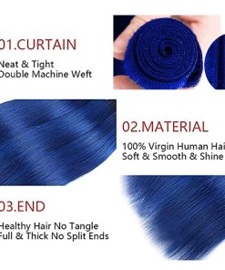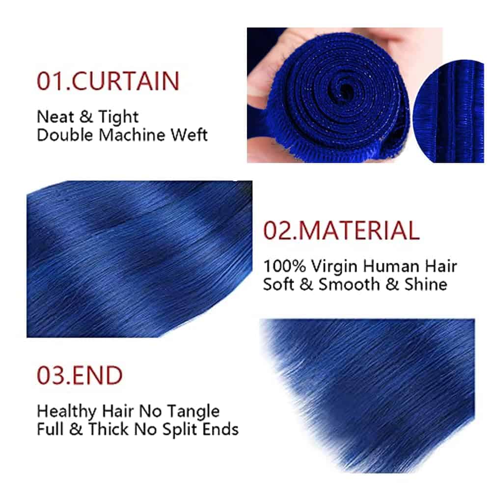 1. Material de cabello azul: Paquetes de cabello humano virgen Remy brasileño 8A sin procesar. Suave, liso y fácil de manejar.