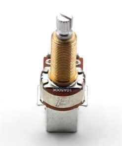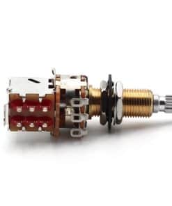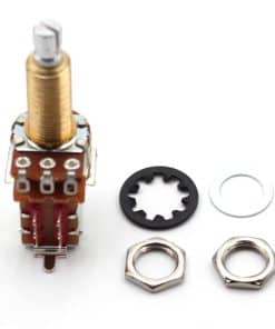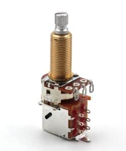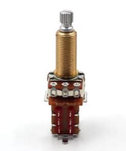 Dos potenciómetros Bourns 500K push/pull, de eje largo (con rosca de 3/4″) SPLIT con eje estriado de 18 dientes. Este potenciómetro te permite realizar modificaciones en el cableado de tu guitarra sin tener que modificar el cuerpo de la misma. Se utiliza para dividir bobinas, tocar bobinas y cambiar de fase. Este potenciómetro tiene un eje corto (la rosca tiene 3/8″ de alto y 3/8″ de diámetro, el eje tiene 1/4″ de diámetro). El potenciómetro está fabricado por Bourns. Nota: 1. Requiere un agujero de montaje de 3/8″ de diámetro. 2. Si tienes una guitarra de importación, es probable que esté utilizando componentes de tamaño métrico y estos potenciómetros no se pueden utilizar sin modificar las aberturas de tu guitarra.