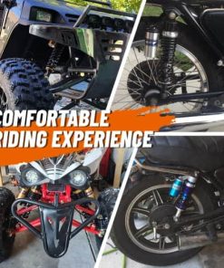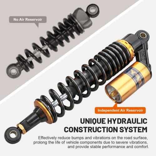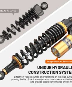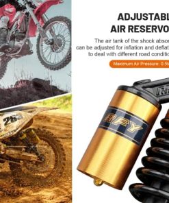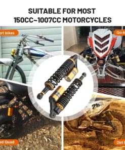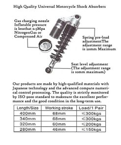 Compatibilidad: Ajuste universal. Funciona perfectamente en la mayoría de las motos de calle de 150cc~750cc, Karting (Go kart), Scooters y Quad de Moped (ATV) con amortiguadores de distancia de ojo a ojo de 375mm. Excelente elección para reemplazo, actualización de estilo y todo tipo de modificaciones en la motocicleta. Por favor, verifica las dimensiones a continuación antes de comprar. Dimensiones: Longitud total: 430mm. Longitud de núcleo de ojo a ojo: 400mm. Diámetro del ojo (con casquillo): 12mm. Diámetro del ojo (con casquillo retirado): 16mm. Grosor del ojo: 21mm. Resistencia máxima a la tracción del ojo: 2,000 Kgf. Grosor del resorte: 8mm. Ancho del resorte: 60mm. Recorrido de trabajo: 68mm. Rigidez del resorte: 110 kg. Carga máxima: 300 kg. Depósito de aire: Ajustable. Presión de aire de fábrica: 0.4 Mpa. Presión máxima de aire: 0.5 Mpa. No se incluye manual de instalación. Se recomienda que un mecánico cualificado instale o verifique después de la instalación de este producto. Paquete incluido: Un par de amortiguadores. Otros tamaños de amortiguadores para tu referencia: 320mm (de distancia de ojo a ojo): B015ZJRE22. 340mm (de distancia de ojo a ojo): B015ZKFCPW. 375mm (de distancia de ojo a ojo): B015ZIXDG4. 400mm (de distancia de ojo a ojo): B015ZHDD1U.