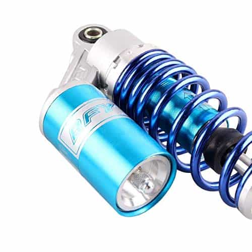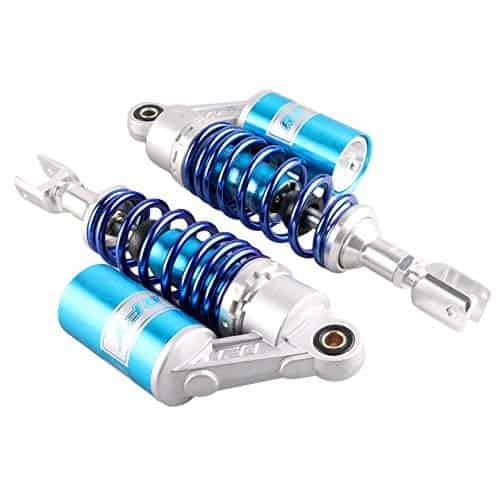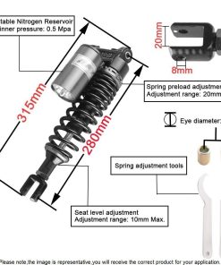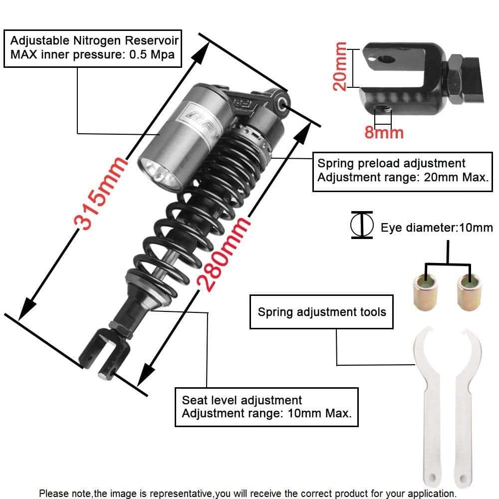 Un par de amortiguadores de aire traseros de 280 mm para motocicleta Mallofusa, fabricados con aluminio y acero inoxidable de alta calidad. Estos amortiguadores universales son compatibles con Honda, Yamaha, Suzuki, Kawasaki, con un diámetro de agujero redondo en la parte inferior de 12 mm y una longitud entre agujeros hasta Clevis de 280 mm. La instalación es sencilla, ya que se reemplazan directamente con el amortiguador original. Perfectos para motocicletas de calle de 150 cc – 750 cc, karting (Go kart), scooters y cuatrimotos (ATV) que tienen amortiguadores de 280 mm de largo de ojo a Clevis. Mantén tu viaje suave y seguro con estos amortiguadores de calidad.