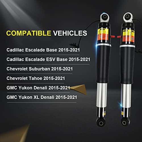 Nuestros productos son productos OEM y la calidad es consistente con los amortiguadores originales. Ofrecemos 1 año de garantía, durante el cual, si nuestro amortiguador tiene algún problema de calidad, le reemplazaremos el nuevo amortiguador de forma gratuita. Puede adaptarse a los siguientes modelos para Cadillac Escalade Base, Luxury, Platinum, Premium 6.2L V8 – Flex 2015-2021. Para Cadillac Escalade ESV Base, Luxury, Platinum, Premium 6.2L V8 – Flex 2015-2016 y Cadillac Escalade ESV Base, Luxury, Platinum, Premium Luxury 6.2L V8 – Flex 2017-2021. Para Chevy Suburban LS, LT, LTZ 5.3L V8 – Flex 2015-2016, Chevy Suburban LS, LT, Premier 5.3L V8 – Flex 2017-2018 y Chevy Suburban LS, LT, Premier 5.3L V8 – Flex, 6.2L V8 – Flex 2019-2021. Para Chevy Tahoe LS, LT, LTZ, PPV, SSV 5.3L V8 – Flex 2015-2016 y Chevy Tahoe LS, LT, PPV, Premier, SSV 5.3L V8 – Flex 2017-2021. Para GMC Yukon Denali, SLE, SLT 5.3L V8 – Flex, 6.2L V8 – Flex 2015-2021 y GMC Yukon XL Denali, SLE, SLT 5.3L V8 – Flex, 6.2L V8 – Flex 2015-2021. Nota: La compatibilidad es solo para referencia, por favor, confirme su número de OEM OEM Number 84176675 580-1106 580-1068 23151122 23267007 23290661 23290660 Estos son amortiguadores OEM que pueden reemplazar perfectamente los originales. Si hay algún problema, contáctenos directamente.