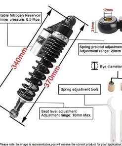 Compatibilidad: Se adapta universalmente a la mayoría de las motocicletas de calle de 150cc~750cc, karts (Go kart), Scooters y Cuatrimotos (ATV) con amortiguadores distanciados de ojo a ojo de 340mm. Excelente elección para reemplazo, actualización de estilo y modificación de la moto. (Por favor, revise amablemente las dimensiones anteriores antes de realizar el pedido.)