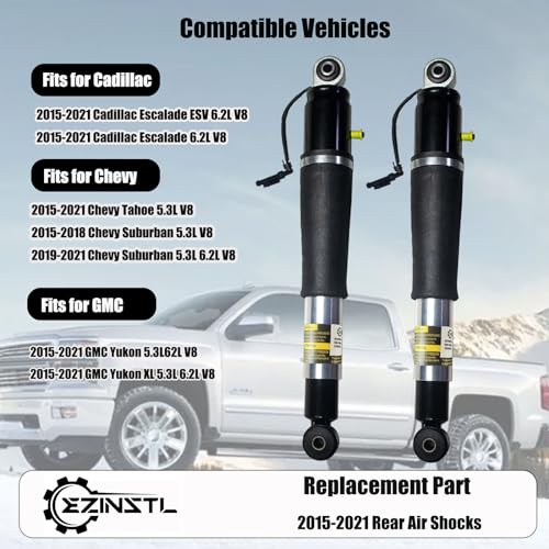 2. Modelo de automóvil compatible con estos amortiguadores de aire: 2015-2021 Cadillac Escalade (ESV), 2015-2021 Chevy Suburban,2015-2021 Chevy Tahoe,2015-2021 GMC Yukon (XL).