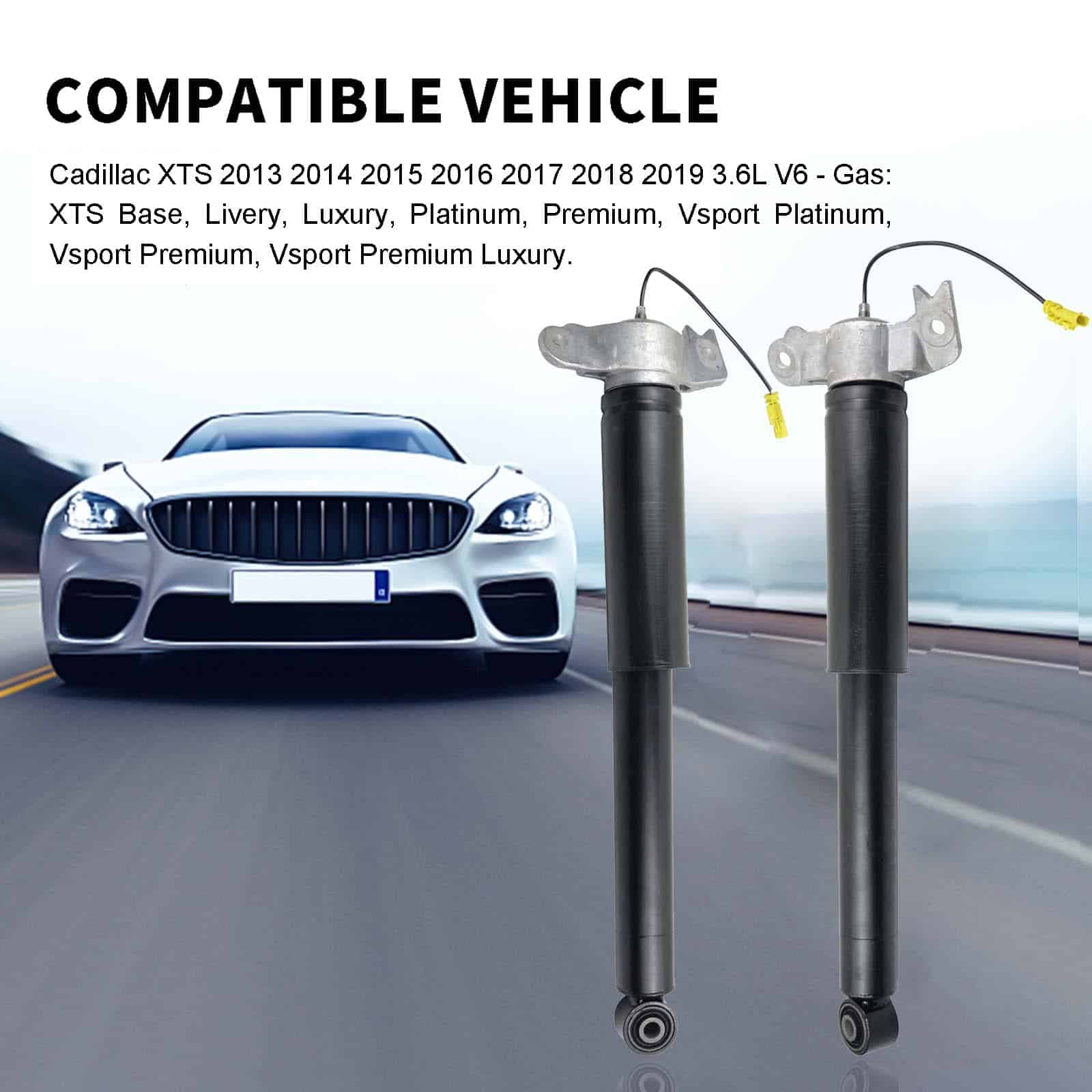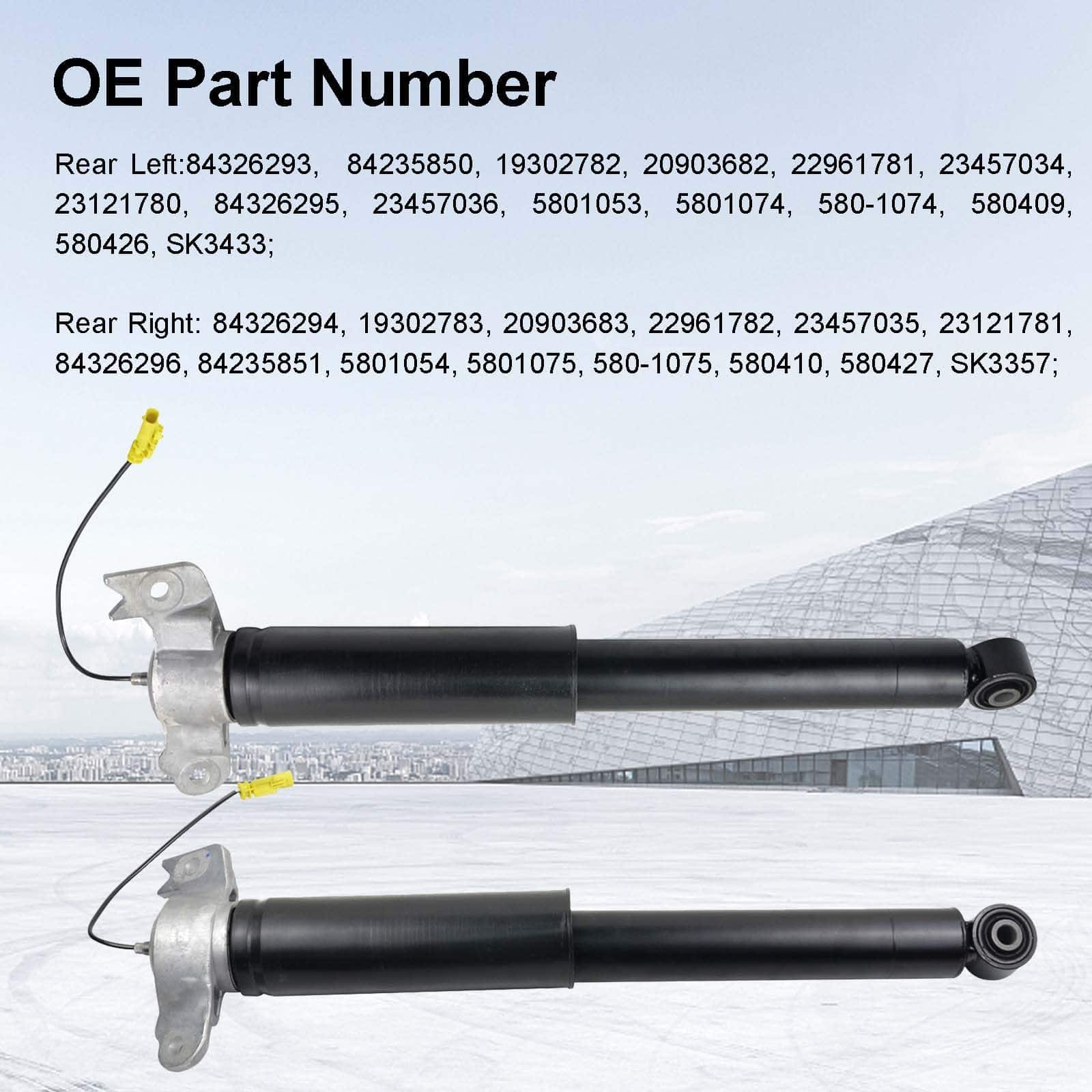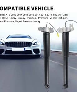 Par de Amortiguadores de Suspensión de Aire Traseros con Montaje Superior de la Asamblea Eléctrica Compatible con Cadillac XTS 2013-2019 3.6L V6 20903683 23457034 84326293 84326294. Los vehículos que tienen suspensión electrónica cuentan con una función de amortiguación automática controlada electrónicamente. Por ejemplo, Cadillac utiliza un amortiguador que contiene un ferrofluido. Cuando se aplica una corriente eléctrica a través del ferrofluido, el aceite cambiará instantáneamente su viscosidad y se volverá más espeso o más delgado. Es difícil pasar un aceite más espeso por estos pasajes que un aceite más delgado, lo que permite que el amortiguador se endurezca instantáneamente según las condiciones de la carretera. Función de los Amortiguadores: Limitar el Movimiento del Vehículo, Estabilizar el Viaje del Vehículo, Estabilizar los Neumáticos del Vehículo, Minimizar el Desgaste de los Neumáticos, Reducir el Desgaste General de la Suspensión. Número de Pieza de Reemplazo: Izquierdo Trasero: 84326293, 84326295, 23457036, 5801053, 5801074, 580409, 580426, SK3433, 19302782, 20903682, 22961781, 23457034, 23121780. Derecho Trasero: 84326294, 84326296, 84235851, 5801054, 5801075, 580410, 580427, SK3357, 19302783, 20903683, 22961782, 23457035, 23121781. Utilizar para los Siguientes Vehículos: Cadillac XTS Base, Luxury, Livery, Premium, Platinum, Vsport Platinum (años 2013-2020).