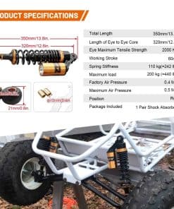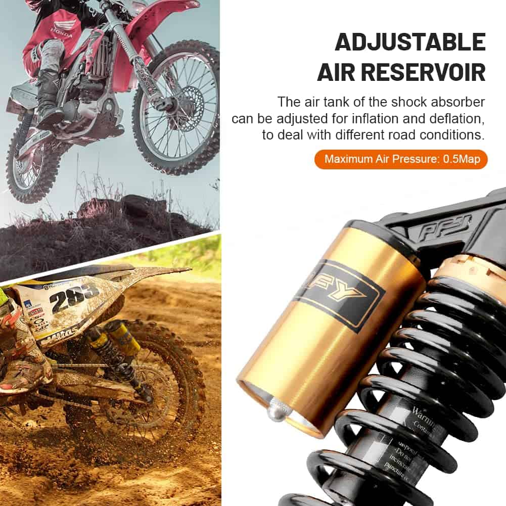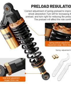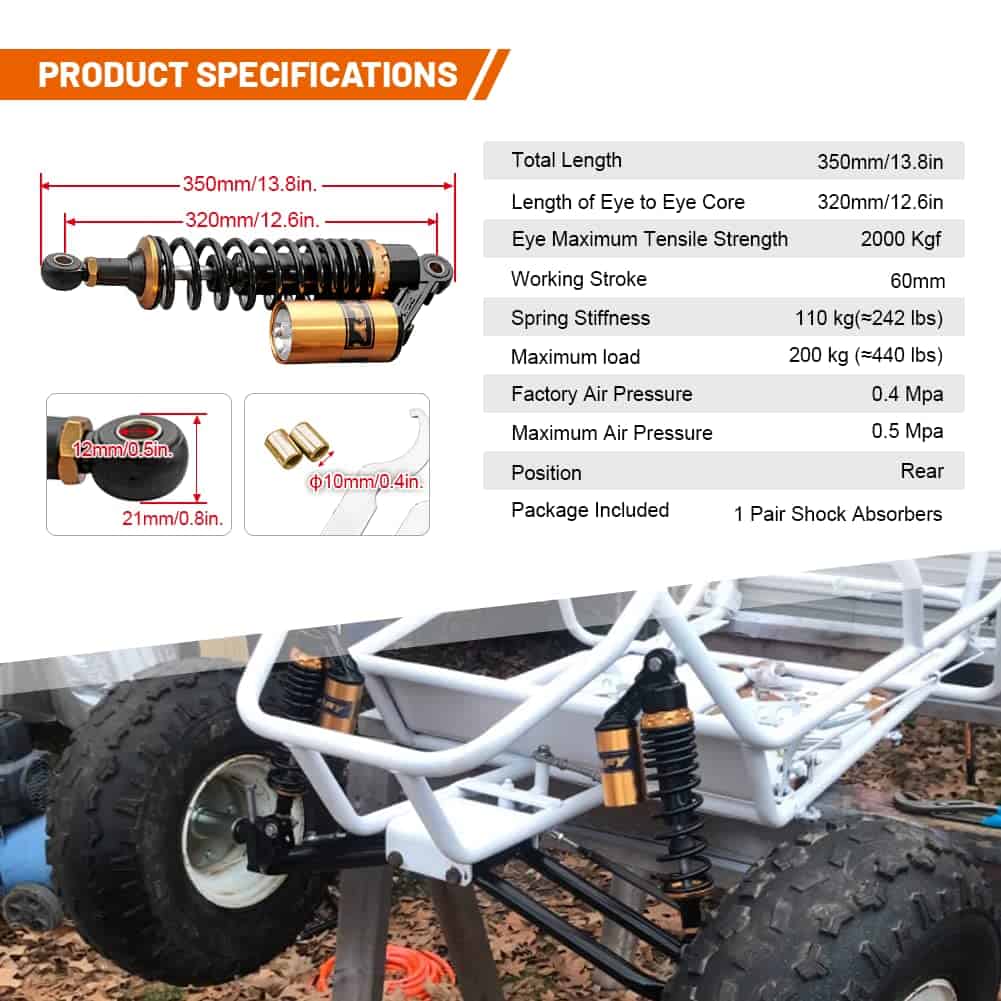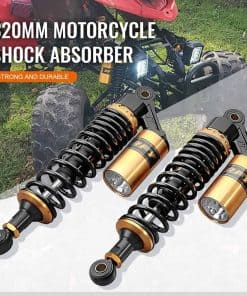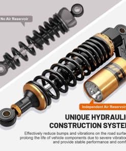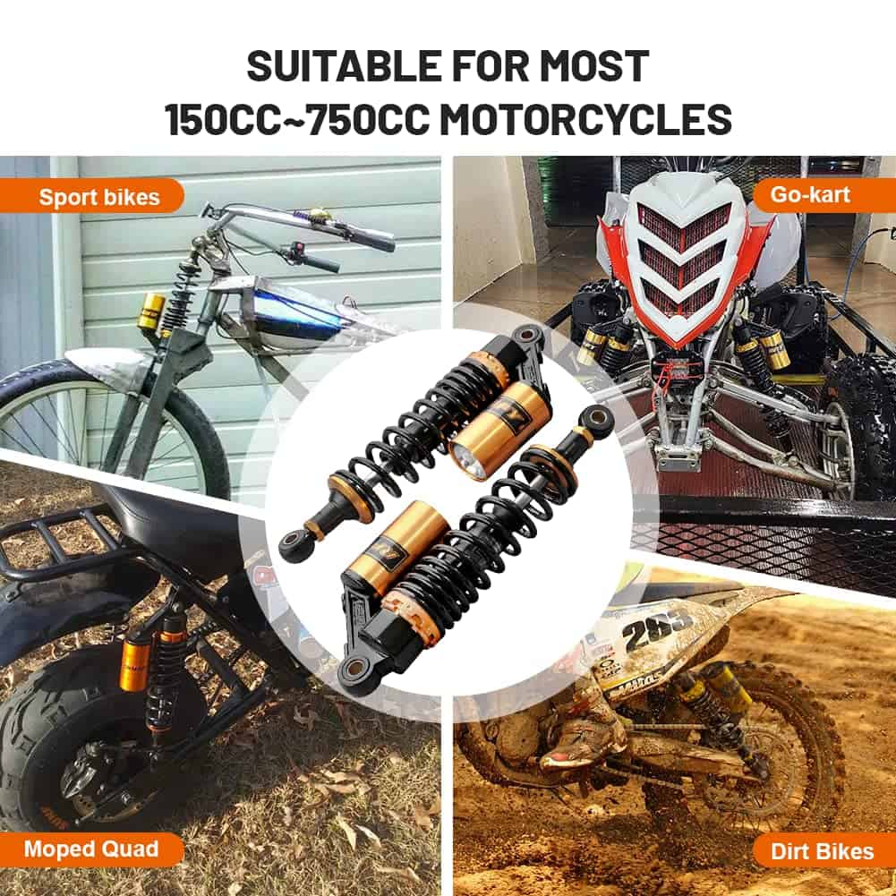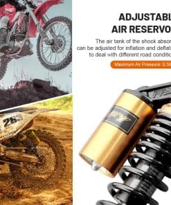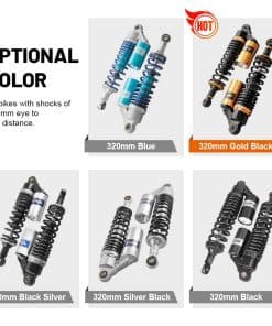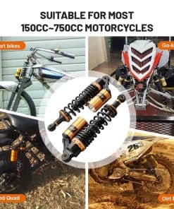 Condición: Nuevo/Nunca usado Amortiguadores traseros de nitrógeno de 320mm (12.59″) A Pair GZYF Ajuste Universal. Funciona perfectamente en la mayoría de las motocicletas de calle de 150cc-750cc, Karting (Go kart), Scooters y Quad Moped (ATV) con amortiguadores de distancia de ojo a ojo de 320mm. Excelente elección para reemplazo, actualización de estilo y todo tipo de modificación de motocicletas. Dimensiones: Longitud total: 350mm (13 3/4″) Longitud del núcleo de ojo a ojo: 320mm (12 5/8″) Diámetro del ojo (con casquillo): 12mm Diámetro del ojo (sin el casquillo): 16mm Grosor del ojo: 21mm Resistencia máxima a la tracción del ojo: 2.000 Kgf Grosor del resorte: 7mm Ancho del resorte: 60mm Carrera de trabajo: 60mm Rigidez del resorte: 110 kg Carga máxima: 200 kg (440 libras) Reservorio de aire: Ajustable Presión de aire de fábrica: 0.4 Mpa Presión de aire máxima: 0.5 Mpa No se incluye manual de instalación. Se recomienda que un mecánico calificado instale o verifique después de la instalación de este producto. Paquete incluido: Un par de amortiguadores Otro tamaño para amortiguadores para su referencia: 320mm (de distancia de ojo a ojo): B015ZJRE22 340mm (de distancia de ojo a ojo): B015ZKFCPW 375mm (de distancia de ojo a ojo): B015ZIXDG4 400mm (de distancia de ojo a ojo): B015ZHDD1U
