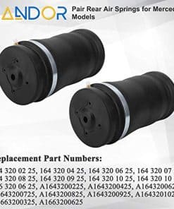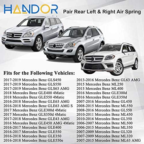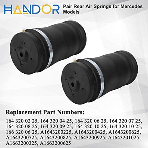1. La bolsa de suspensión de aire es un componente esencial del sistema de suspensión de aire del vehículo. Debido a que las bolsas de resortes de aire y el aire presurizado dentro de ellas son los que soportan el peso del vehículo, si hay fugas de aire, causará caída de la suspensión. Si hay algún problema con la bolsa de aire, las características de manejo y conducción del vehículo pueden verse muy afectadas. Por lo tanto, reemplazar la bolsa de resorte de aire fallida es muy importante. 2. Este Par de Bolsas de Suspensión de Aire Izquierda y Derecha es Compatible con 2017-2019 Mercedes Benz GLS450, 2017-2019 Mercedes Benz GLS550, 2017-2019 Mercedes Benz GLS63 AMG, 2018 Mercedes Benz GLE400 4Matic, 2018 Mercedes Benz GLE550 4Matic, 2016-2018 Mercedes Benz GLE63 AMG, 2016-2018 Mercedes Benz GLE63 AMG S, 2017 Mercedes Benz GLE300d 4Matic, 2017 Mercedes Benz GLS350d 4Matic, 2017-2018 Mercedes Benz GLE43 AMG, 2016 Mercedes Benz GLE450 AMG 4Matic, 2016-2017 Mercedes Benz GLE400;. 3. Compatible con GLE550 2016-2017, GLE350 2016-2018, GLE550e 2016-2018, GL63 AMG 2013-2016, ML250 2015, ML400 2015, Mercedes Benz GLE300d 2016, Mercedes Benz GLE350d 2016, Mercedes Benz GL450 2007-2016, Mercedes Benz ML550 2008-2015, Mercedes Benz GL550 2008-2016, Mercedes Benz ML450 2010-2011, Mercedes Benz GL350 2010-2016, Mercedes Benz ML500 2006-2007, Mercedes Benz ML350 2006-2015, Mercedes Benz GL320 2007-2009, Mercedes Benz ML320 2007-2009, Mercedes Benz ML63 AMG 2007-2015. 4. Números de Pieza de Referencia/Reemplazo para: 164 320 02 25, 164 320 04 25, 164 320 06 25, 164 320 07 25, 164 320 08 25, 164 320 09 25, 164 320 10 25, 164 320 10 25, 166 320 06 25, A1643200225, A1643200425 , A1643200625 , A1643200725 , A1643200825, A1643200925 , A1643201025 , A1663200325 , A1663200625. Se ajusta tanto al lado izquierdo (conductor) como al lado derecho (pasajero) TRASERO, paquete incluido 2 PCS. 5. Estas Bolsas de Resorte de Aire están hechas de material de caucho de alta calidad, duradero en uso. Fabricación profesional, alta sensibilidad, alta confiabilidad. Mejore su conducción con la calidad, confiabilidad y seguridad de primera categoría ofrecidas por las bolsas de aire de reemplazo OE de Handor. Es rápido reemplazar directamente el original sin modificaciones.