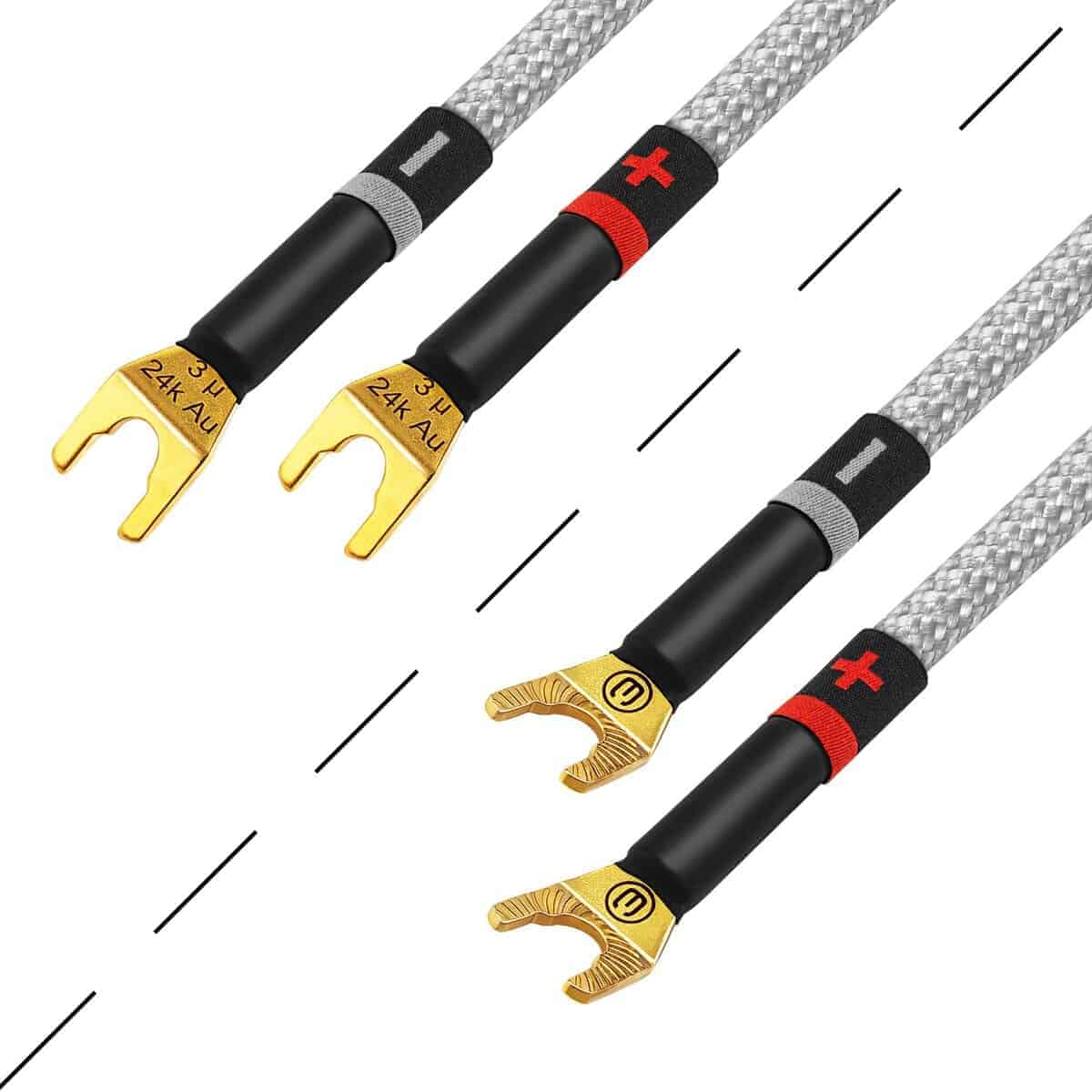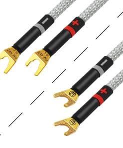 En WBC solo utilizamos conectores de la más alta calidad para estas ensambladuras de cable para audiófilos. Los conectores de pala multi-spade de 24K chapados en oro de Eminence de 3 micrones, de grado audiófilo, (compatibles con postes de conexión de 8mm y 6mm), proporcionan una resistencia superior a la abrasión y la corrosión, y un rendimiento incomparable. Los enchufes de pala están especialmente reforzados para soportar cables de calibre pesado (perfil más grueso).
