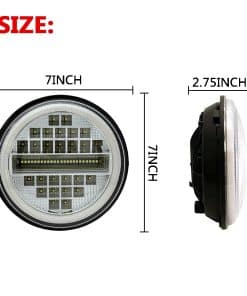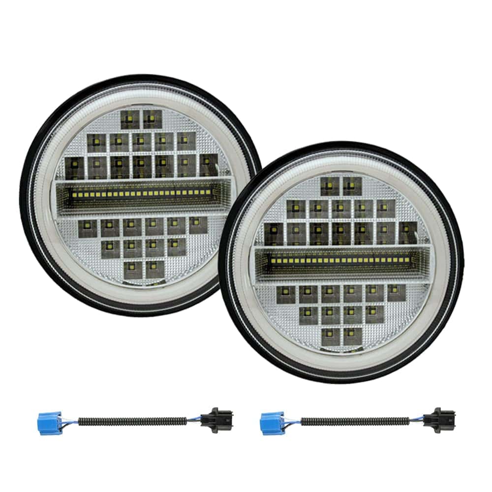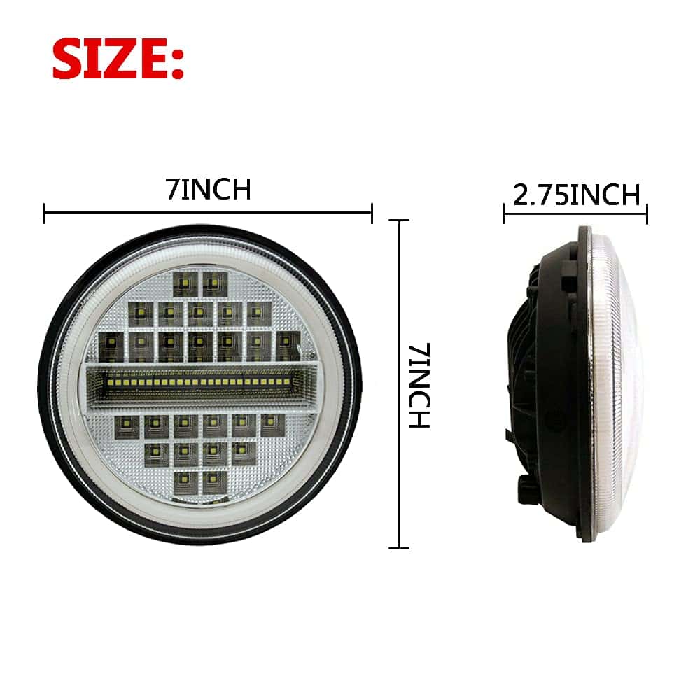 Par de faros LED redondos de 7 pulgadas de la marca AMUNIESUN con luz de halo blanco de alta y baja intensidad y señal de giro ámbar. Estos faros cuentan con cuatro patrones de iluminación: luz blanca fría de 6000K de alta intensidad (6500LM), luz baja de 4300LM, luz diurna y luz de giro ámbar. Son un 50% más brillantes que los faros originales halógenos e HID. Fabricados con carcasa de aluminio fundido y lente de policarbonato, estos faros tienen un diseño de refrigeración eficiente, carcasa sellada y son impermeables IP67, a prueba de óxido y golpes. La instalación es sencilla y son un excelente reemplazo, con un adaptador de conversión H4 a H13 incluido. Son compatibles con varios modelos como TJ (1997-2006), CJ-8 Scrambler (1981-1985), CJ-7 (1976-1986), TJ Unlimited / LJ (2003-2006), JK 2 Puertas (2007-2015), JK 4 Puertas Unlimited (2007-2015) y otros. El paquete incluye 2 faros LED redondos de 7 pulgadas, 2 kits de adaptadores de conversión H4 a H13 y cuenta con una garantía de 1 año.