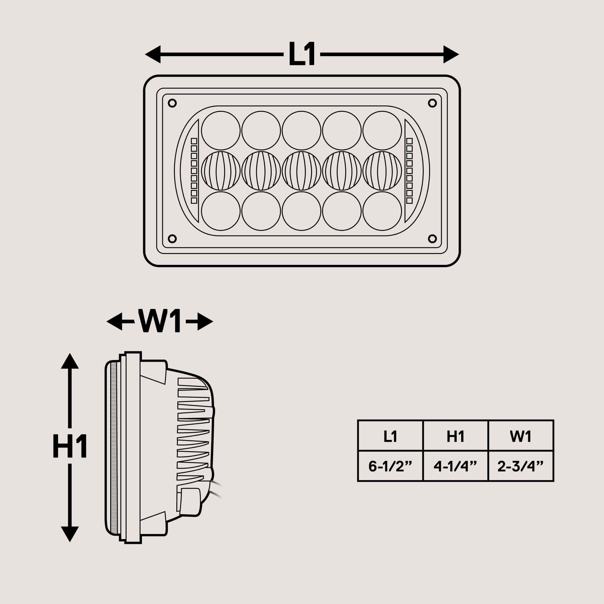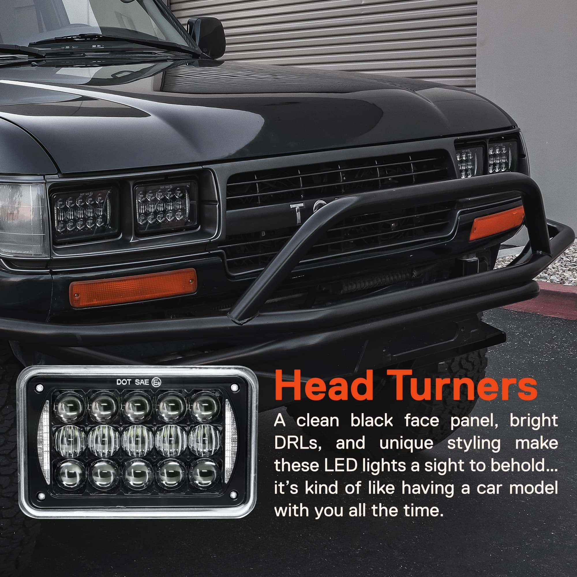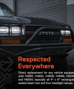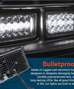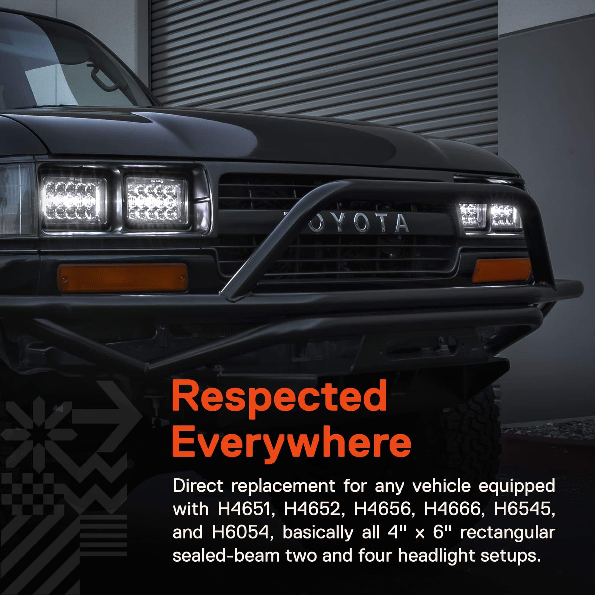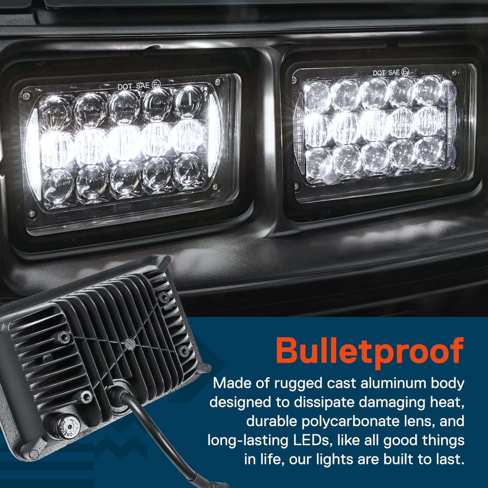 1. FLAMETHROWERS LEGALES EN LA CALLE: ¡Ilumina la calle con faros LED súper brillantes de 4 x 6 pulgadas que emiten 4,800 lúmenes de luz blanca pura de 6500K a partir de LEDs de alta intensidad de 3W! La forma más responsable de disparar fuego desde tu vehículo. 2. HEAD TURNERS – Un panel frontal negro limpio, DRL brillantes y un estilo único compatible con Nissan, Jeep o GMC hacen de estos ensambles de carcasa de bombilla LED de faros de 4 x 6 pulgadas un espectáculo. Es como tener un modelo de coche contigo todo el tiempo. 3. A PRUEBA DE BALAS – Hecho de un cuerpo de aluminio fundido resistente diseñado para disipar el calor dañino, una lente de policarbonato duradera y LEDs de larga duración, como todas las cosas buenas en la vida, nuestra asamblea de faros rectangulares de 6 x 4 pulgadas está hecha para durar. 4. RESPETADO EN TODAS PARTES – Reemplazo directo para: Chevy C10, K10, Kodiak, C4500 (C 4500) y una amplia gama de vehículos equipados con bombillas halógenas de faro sellado rectangular H4651, H4652, H4656, H4666, H6545 y H6054 2a1 1a1 de 4′ x 6′. 5. CONSUMIENDO POCO ENERGÍA – Con un máximo de solo 1.8 amperios a 12V, estas lámparas de faro sellado hi lo 4 x 6 pulgadas del mercado de accesorios automotriz con conector de base de bombilla H4 disminuyen el estrés de tu sistema eléctrico. Por lo que no solo duran más, incluso pueden mejorar la vida de tus otros componentes eléctricos. 6. LISTA PARA CAMIONES COMERCIALES – Para la máxima comodidad, estos faros LED 4×6 6×4 han sido fabricados para trabajar con muchos semirremolques y son compatibles con: Peterbilt 379, 378, 385, 377, 375, 376, 372, 365, 367, 362, 357, 330, 320, 265, 224, Kenworth T800, T 800, W900, W 900, T600, T 600, C500, C 500, C550, C 550, K100, K 100, K130, K 130 y Freightliner FLD120, FLD 120, Classic XL.