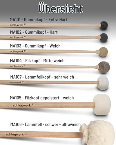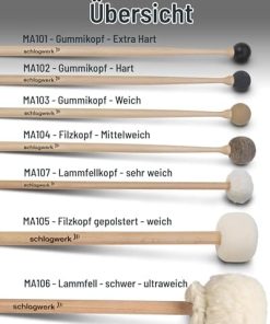 La línea de mazas Schlagwerk fue especialmente desarrollada teniendo en cuenta el uso de cada instrumento diferente. Por lo tanto, el grado de dureza de los compuestos de goma juega un papel decisivo en el sonido del instrumento. Diferentes baquetas ofrecen más variabilidad en la formación del sonido.