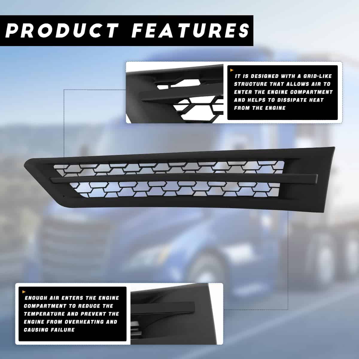 Pair Black Cascadia Hood Side Grille Air Intake Vent Replacement with With Bug Screen for Freightliner Cascadia 2018+ es un conjunto de rejillas de admisión de aire del capó lateral diseñado para ser compatible con Freightliner CASCADIA a partir del año 2018. Estas rejillas están fabricadas con plástico ABS premium, lo que les confiere resistencia a los elementos y peligros de la conducción todoterreno, siendo duraderas, sin decoloración, impermeables y resistentes a impactos. Su instalación es muy fácil, ya que no se requiere modificación ni taladrado gracias a las piezas prefabricadas de Rejilla del Radiador Lateral del Capó Delantero con Malla Antinsectos. El reemplazo atornillado preconfigurado facilita enormemente la instalación. En nuestro compromiso por brindar el mejor servicio y valor a los consumidores, garantizamos la calidad del producto. Si tiene alguna inquietud o pregunta, no dude en contactarnos.
