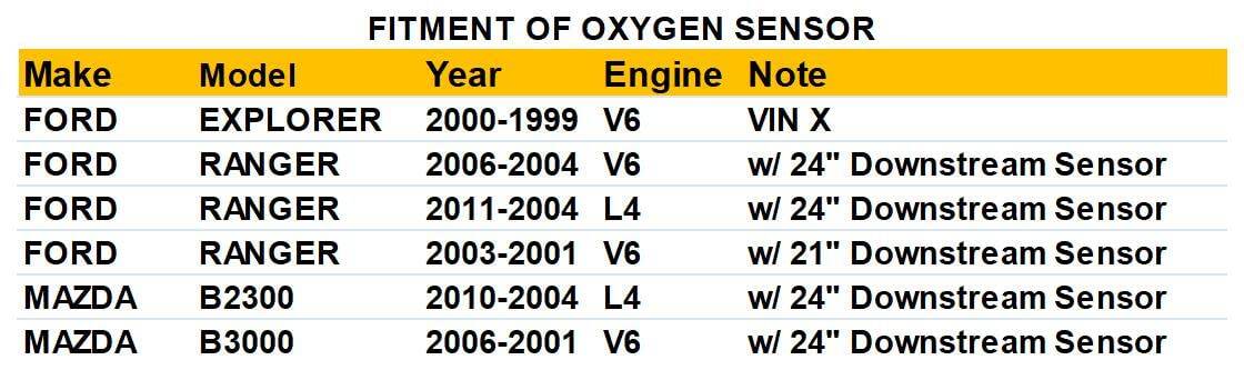 3. Aplicación de Repuesto para Ford Explorer 2000-1999 VIN X 4L, Ranger 2011-2004 con 24″ Sensor Downstream 2.3L, Ranger 2006-2004 con 24″ Sensor Downstream 3L, Ranger 2003-2001 con 21″ Sensor Downstream 3L.