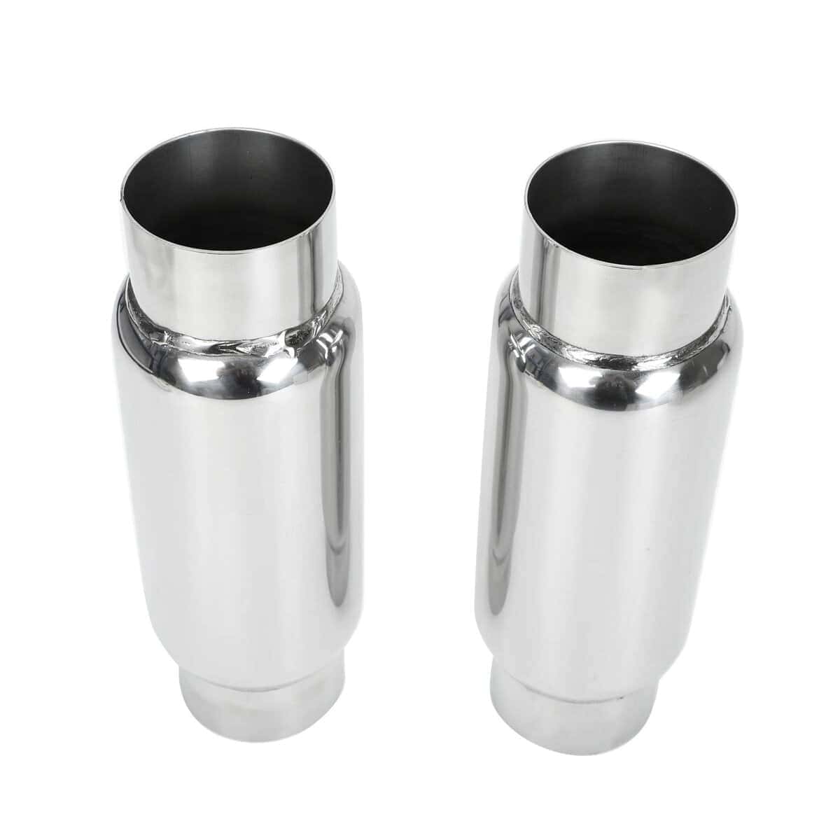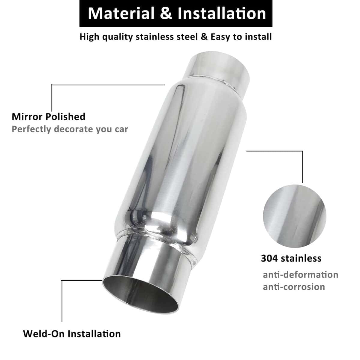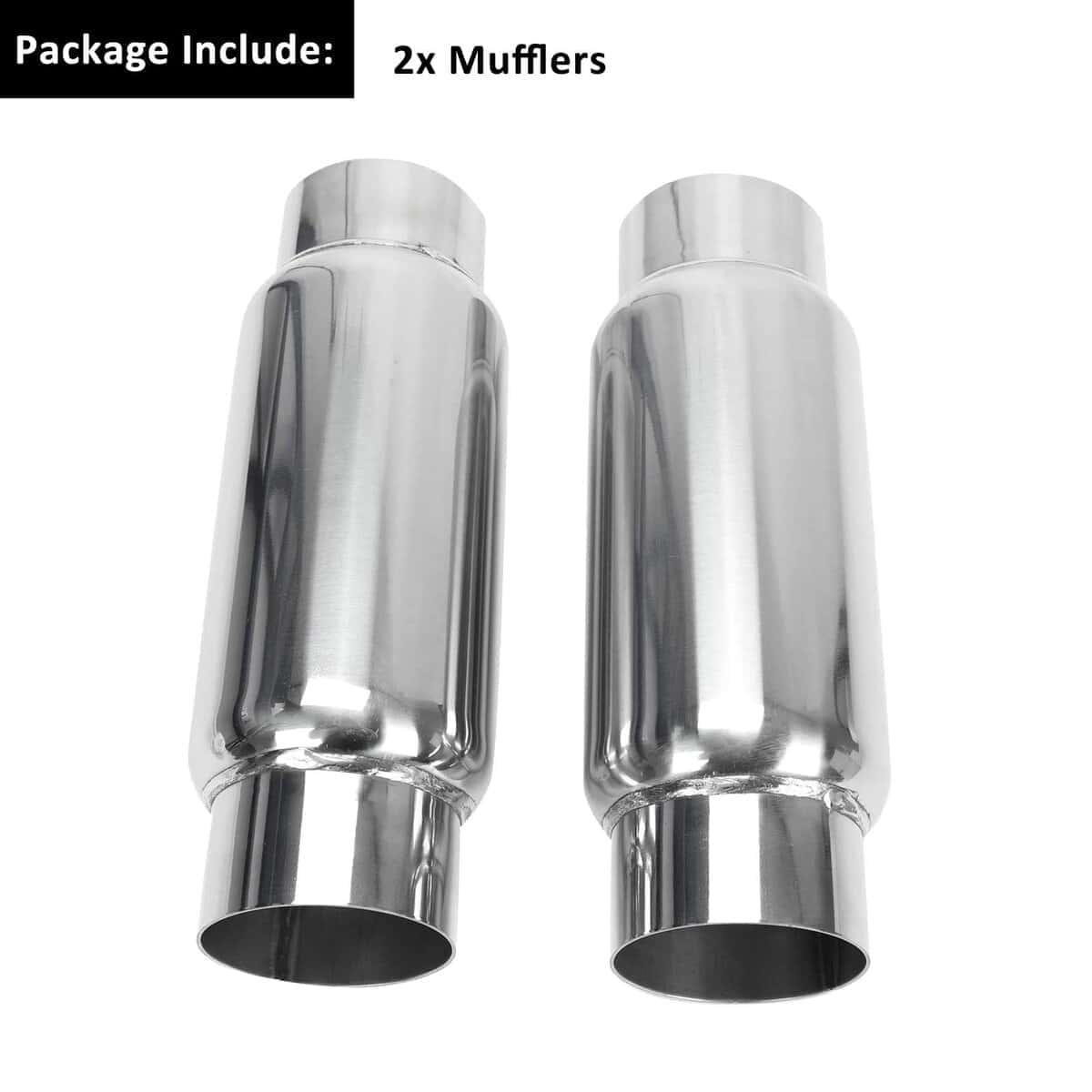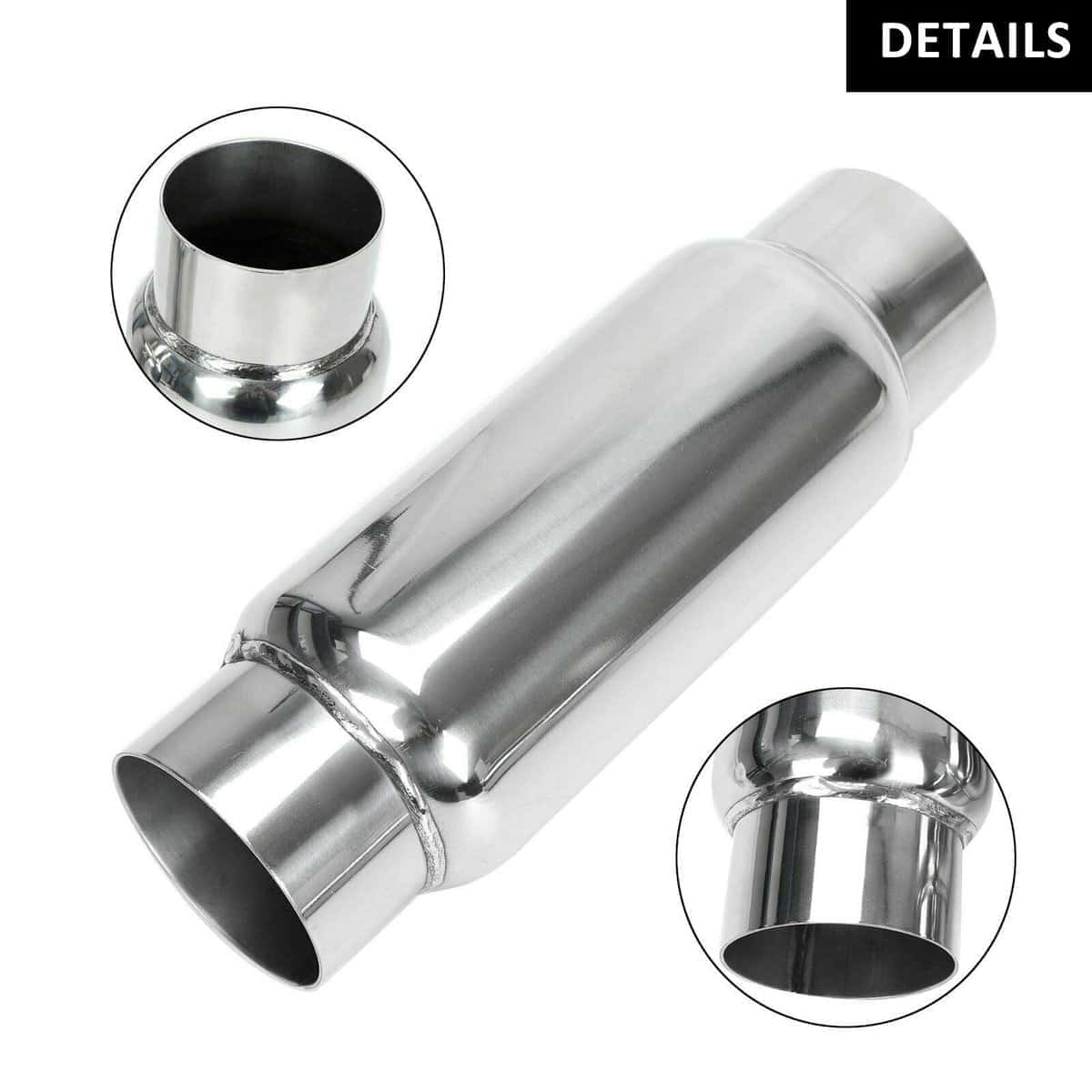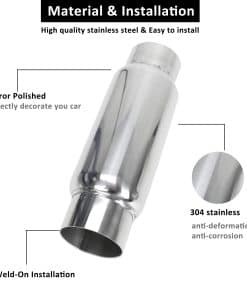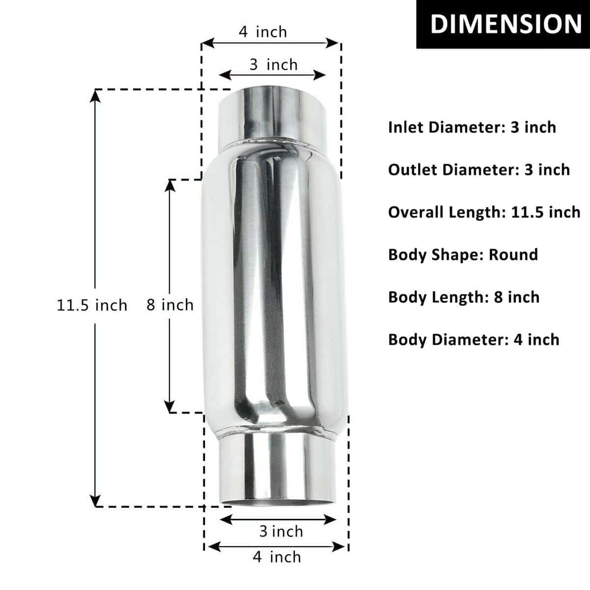 Descripción: – 100% Soldado mecánicamente, Construcción duradera para una larga vida útil. – Silenciador universal de alto rendimiento. – El acero inoxidable tiene una función protectora, resistencia a la corrosión y resistencia al calor. – Núcleos perforados rectos para el flujo más alto posible. – Diseñado para amortiguar el ruido de escape, Facilita el flujo de escape sin interrupciones. El silenciador que era más silencioso con un tono suave. – Se recomienda una instalación profesional – No se incluyen instrucciones Especificación – Longitud Total: 11.5 pulgadas – Forma del Cuerpo: Redonda – Longitud del Cuerpo: 8 pulgadas – Diámetro del Cuerpo: 4 pulgadas – Diámetro de Entrada: 3 pulgadas – Diámetro de Salida: 3 pulgadas – Tipo de Conexión de Entrada y Salida: Conexión de tubería – Material del Silenciador: Acero inoxidable Paquete Incluido: — 2x Silenciadores — Como se muestra en la imagen arriba