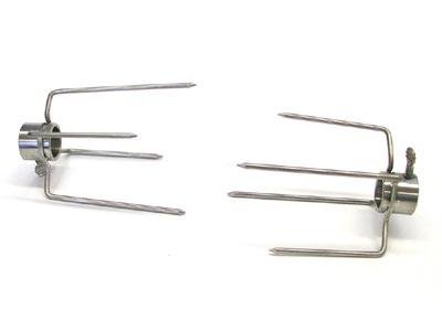 Se aprietan con tornillos regulables y están hechos de acero inoxidable de grado alimenticio. Son mejor adecuados para animales enteros más pequeños como pollos o pavos o cortes más grandes de carne como un asado de costilla o pierna de cordero. Para cerdos enteros de más de 20 lbs, recomendamos nuestros tenedores más grandes.