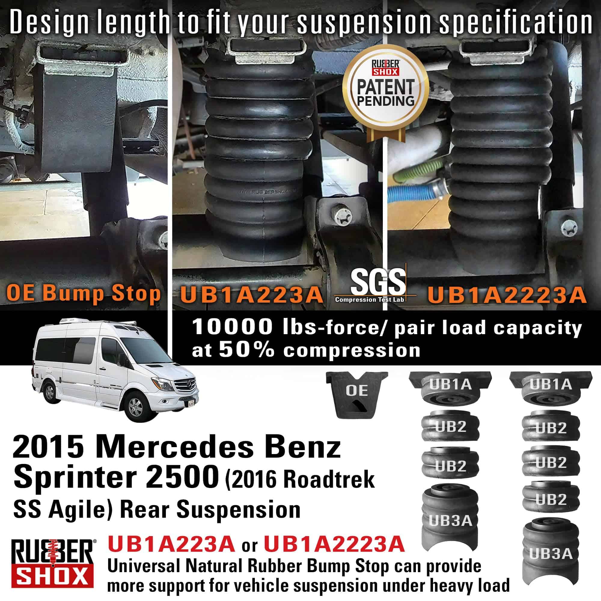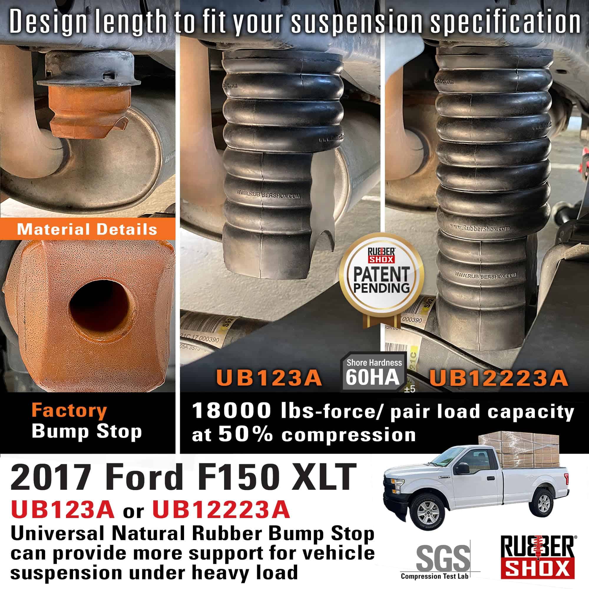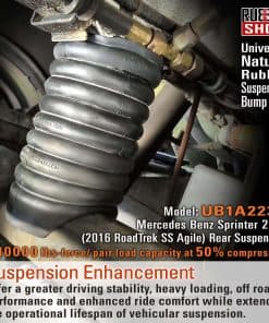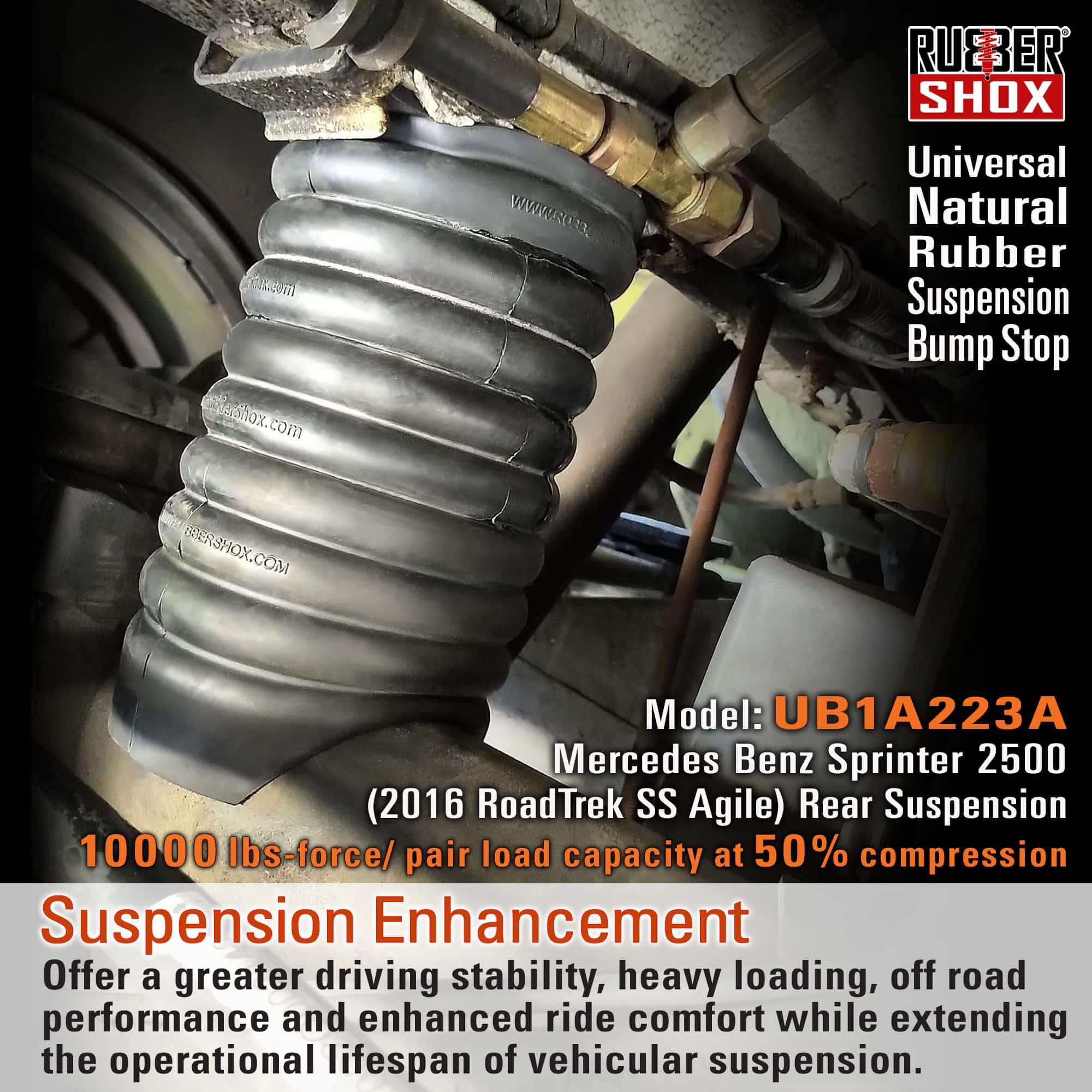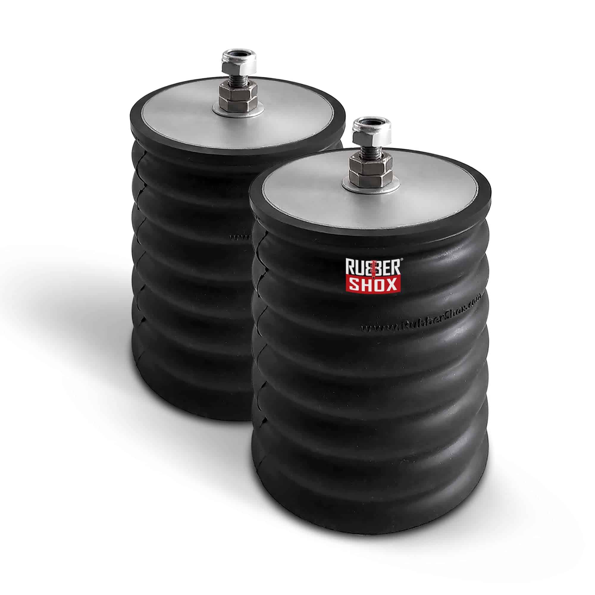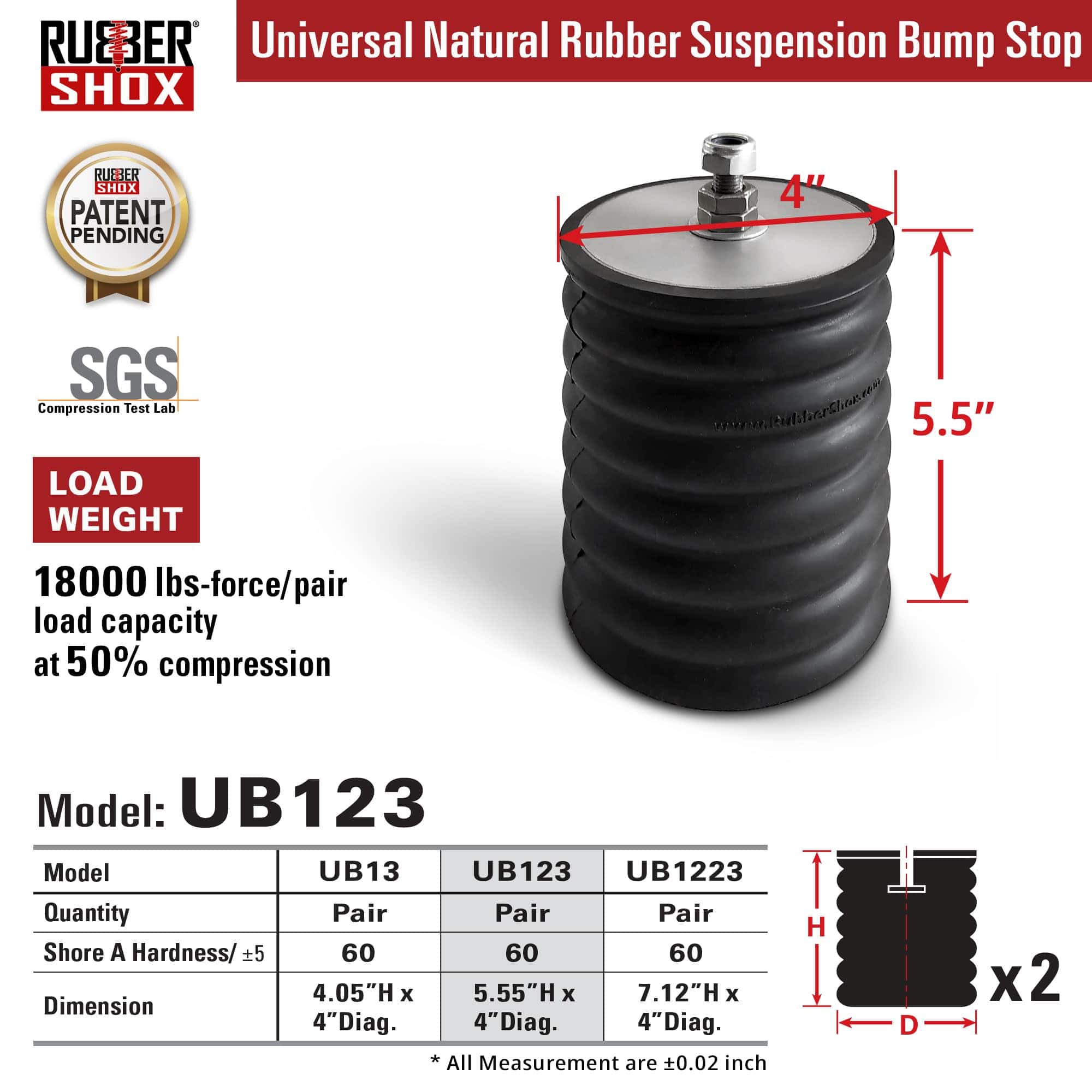 Topes de goma universal RubberShox. Es un amortiguador de topes de goma natural para el sistema de suspensión delantero/trasero de camiones o vehículos recreativos (RV). Un soporte de suspensión de topes de goma natural sin mantenimiento. Mientras que el contacto inicial es suave y luego aumenta la rigidez linealmente. Ofrece una mayor estabilidad de conducción, carga pesada, rendimiento todoterreno y mayor comodidad al conducir mientras se extiende la vida operativa de la suspensión vehicular. Capacidad de carga de 4500/9000 lbs-force pc/par al 50% de compresión.