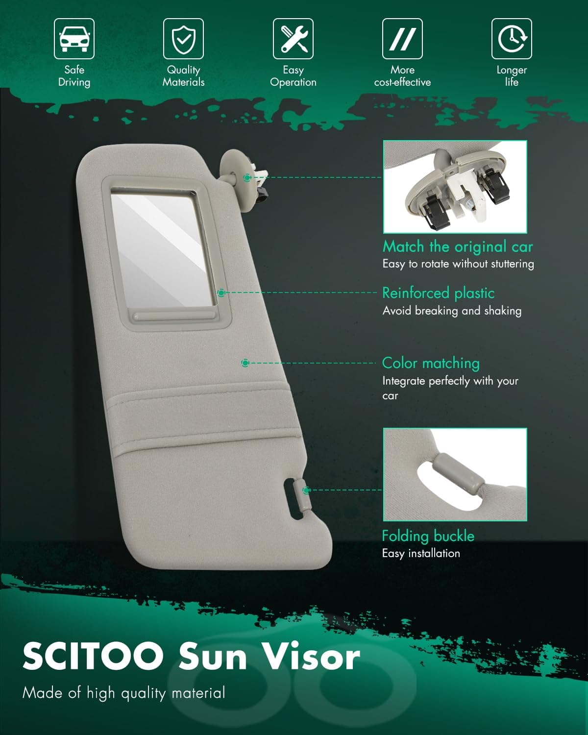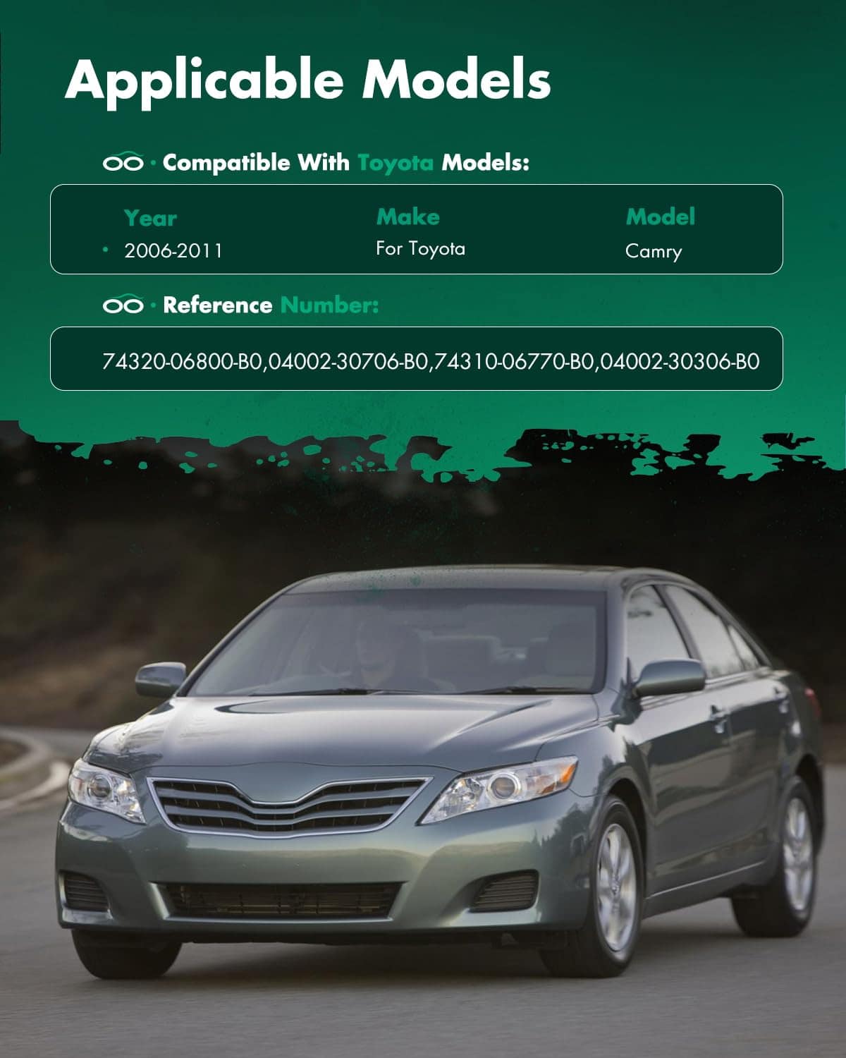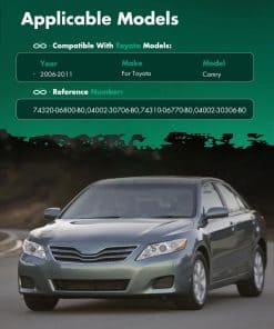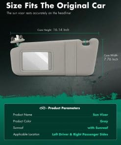 1. Aplicación: Toyota Camry Sedan de 4 puertas con Sunroof del año 2006 al 2011. 2. Números de reemplazo: 74320-06800-B0, 04002-30706-B0, 74310-06770-B0. 3. Material: Fabricado con tela de alta calidad, cómodo al tacto y duradero. 4. Reemplazo ajustado: La mejor sustitución para tu visera vieja, rota o desgastada. Con nuestra visera, no tendrás que preocuparte por la luz solar intensa que interfiera con tu visión y garantiza una conducción cómoda. 5. Aviso: Asegúrate de verificar correctamente la información de aplicación Año/Marca/Modelo antes de realizar el pedido, ¡si tienes algún problema con el modelo, contáctanos!