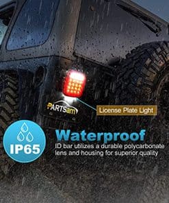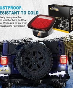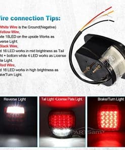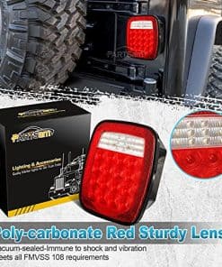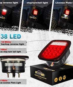 Paquete incluye 2 luces traseras universales cuadradas de 12V con 38 LEDs: 16 LEDs rojos para funciones de freno/dirección/luz trasera, 18 LEDs blancos para función de reversa, 4 LEDs blancos para iluminador de licencia. Fácil de instalar en cualquier superficie plana. Cumple con normas DOT para iluminación legal en la calle. Universal, compatible con vehículos y remolques de 12V.