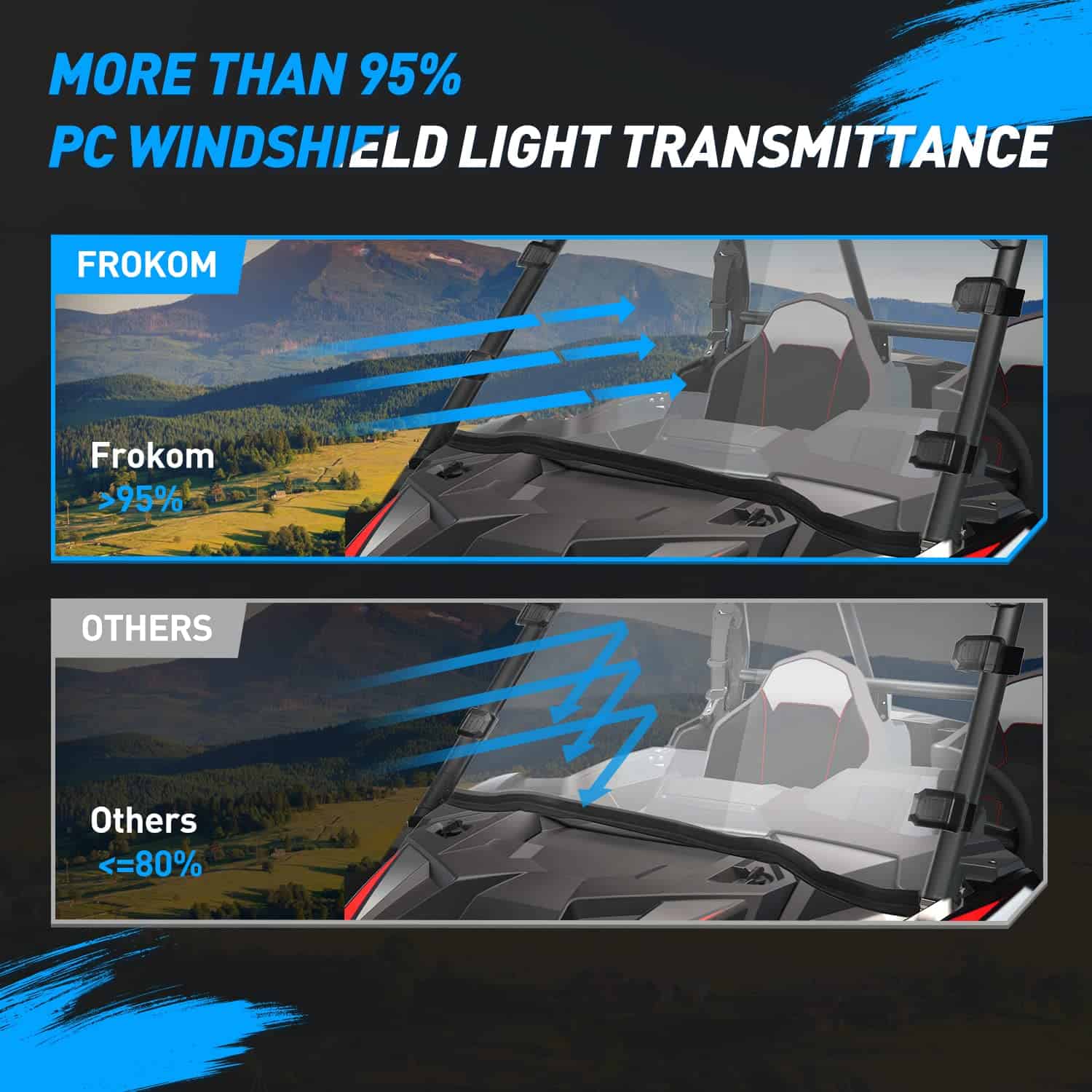 2. Visión cristalina: Fabricado con materiales de PC de alta calidad, nuestro parabrisas garantiza una transmisión de luz del 95% y suaviza la radiación, brindándote una vista clara al conducir.