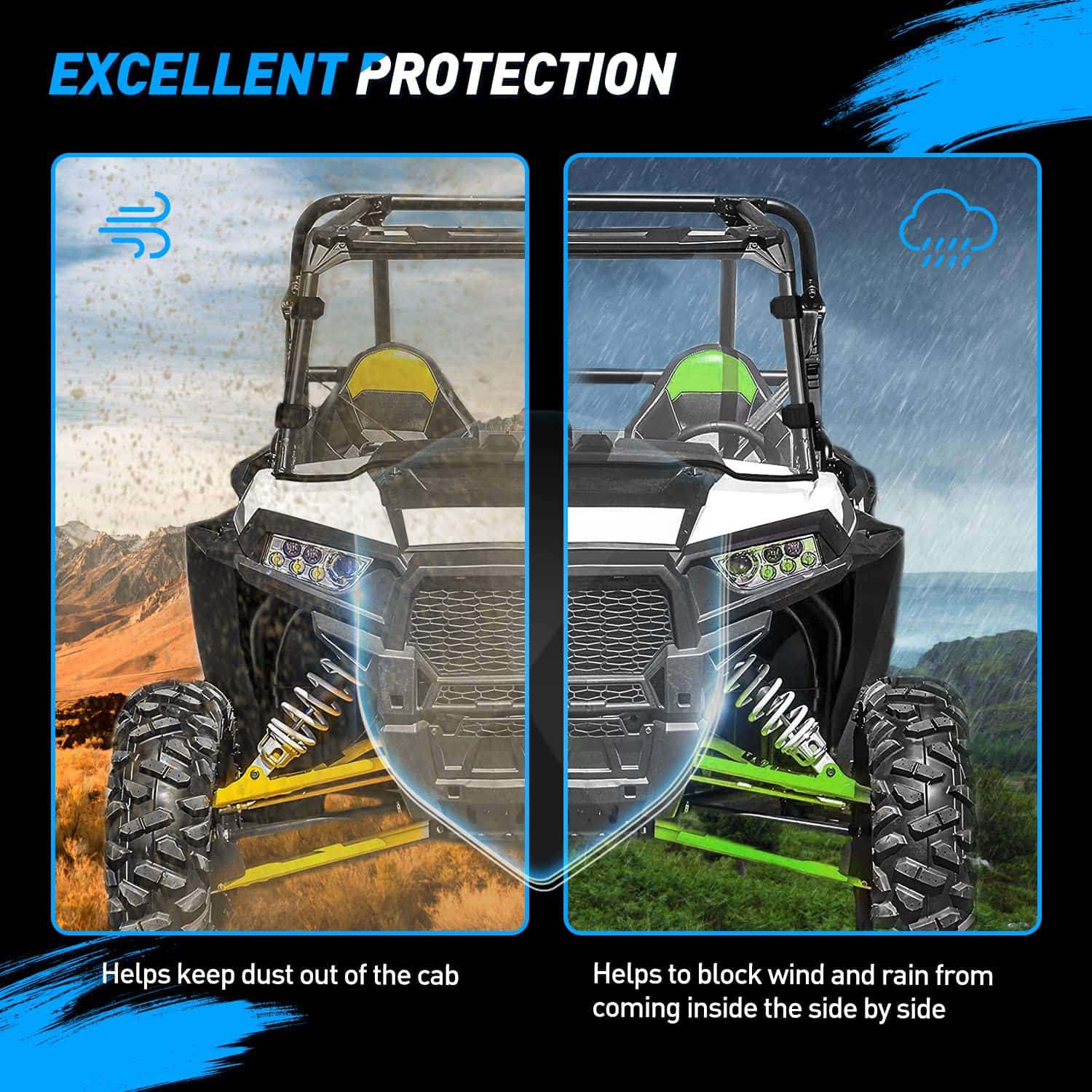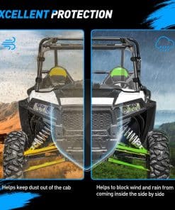 5. Buena protección: Nuestro parabrisas completo delantero protegerá tu vehículo manteniendo el polvo y la suciedad fuera de la cabina, bloqueando el viento y la lluvia para que no entren en el interior, y manteniendo al conductor y pasajeros seguros de la lluvia y el polvo al conducir al aire libre.