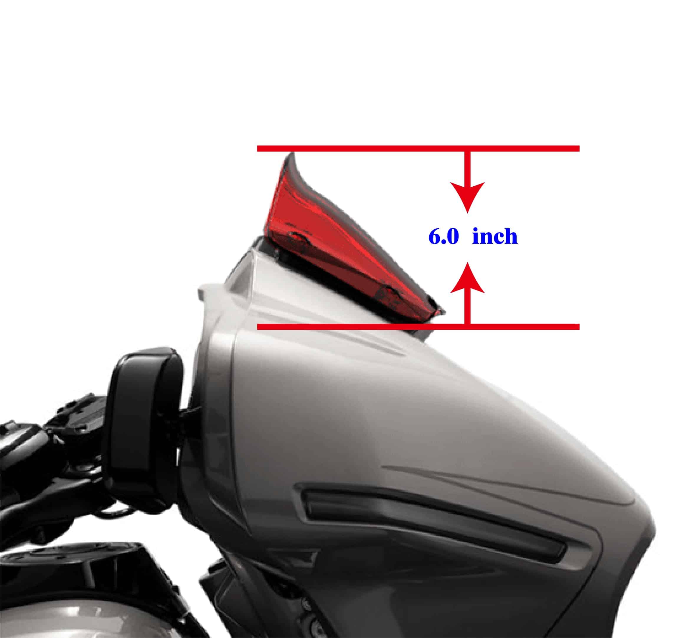 Hecho de materiales acrílicos PMMA al 100%, los cuales son transparentes y coloridos. Terminado con pulido, es suave y brillante en el borde. 8.0″ de alto y se eleva aproximadamente 5.5 a 6.0 pulgadas sobre la carenado. Con un deflector de aire en la parte superior, que disminuirá el ruido en la carretera. Se ajusta a Harley Davidson 2023 CVO Street Glide, 2024 Street Glide y FLHXSE.