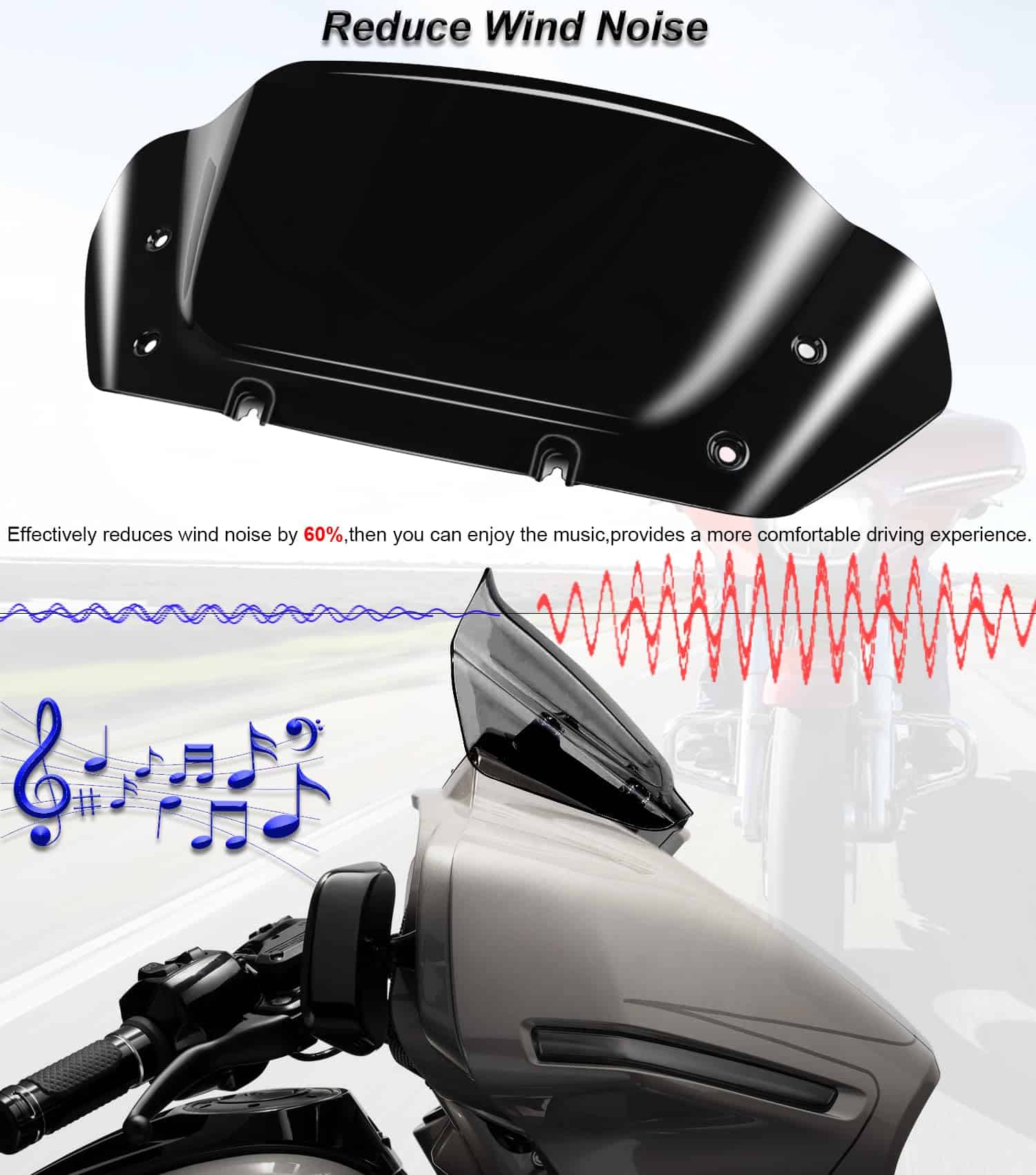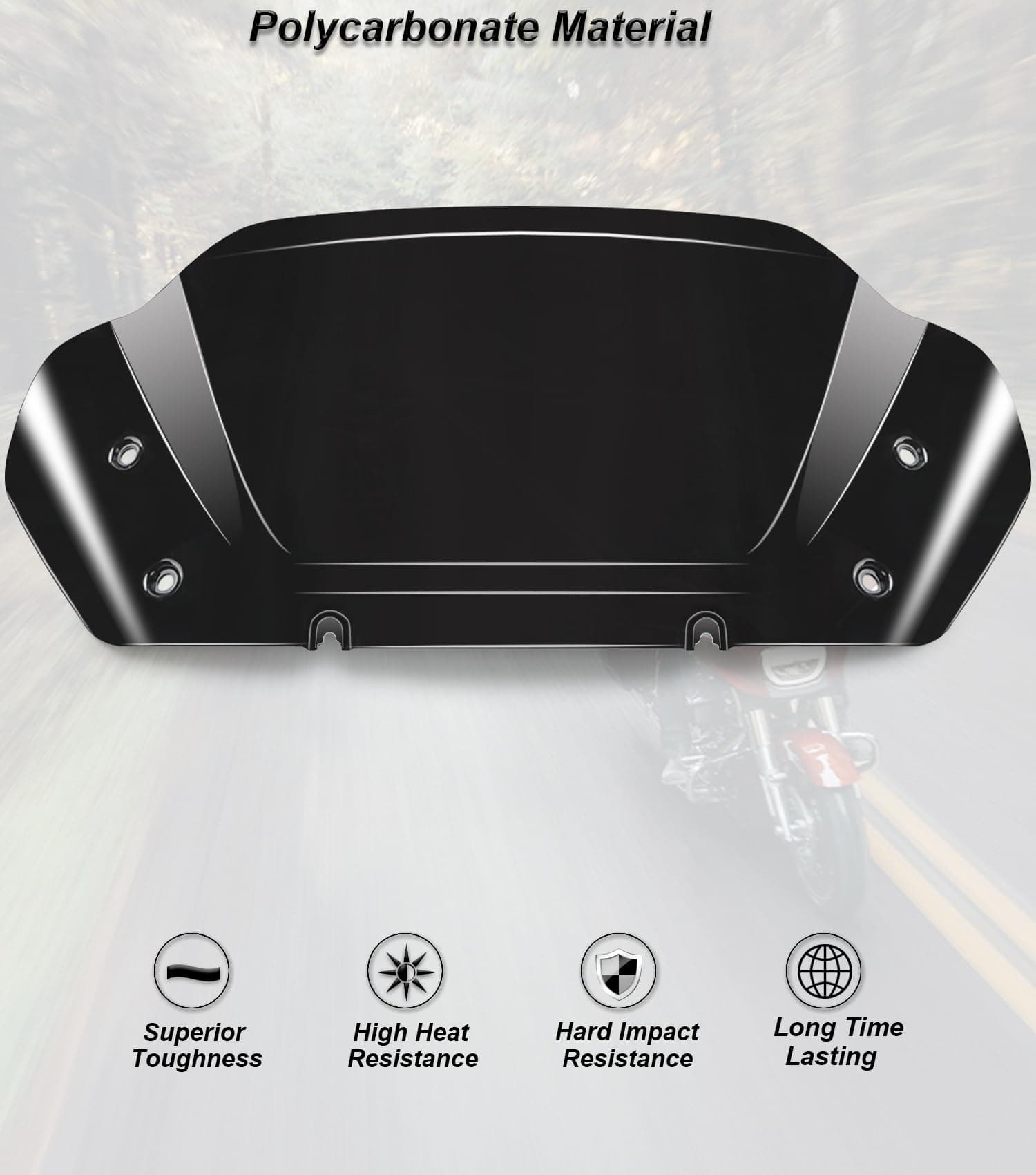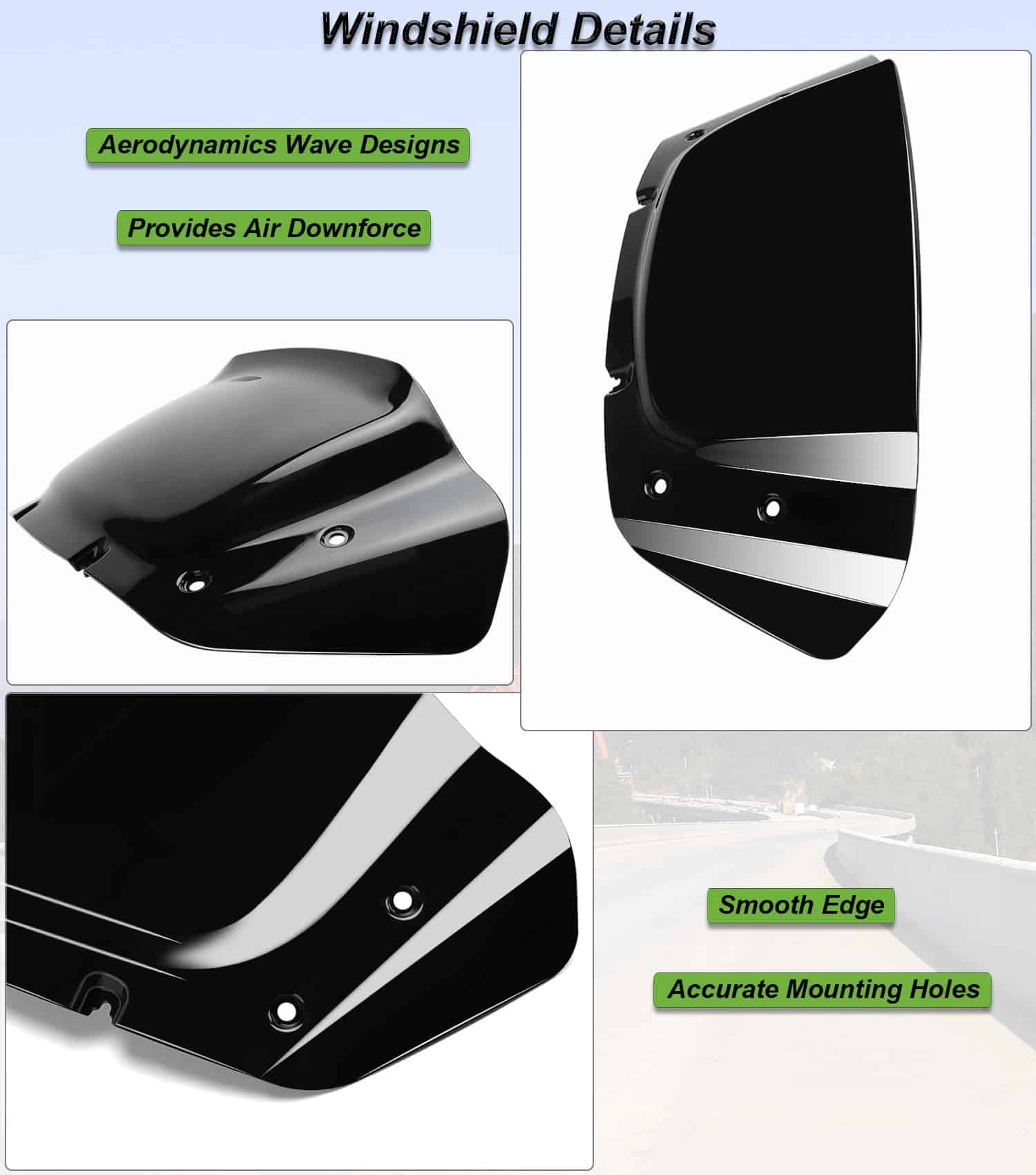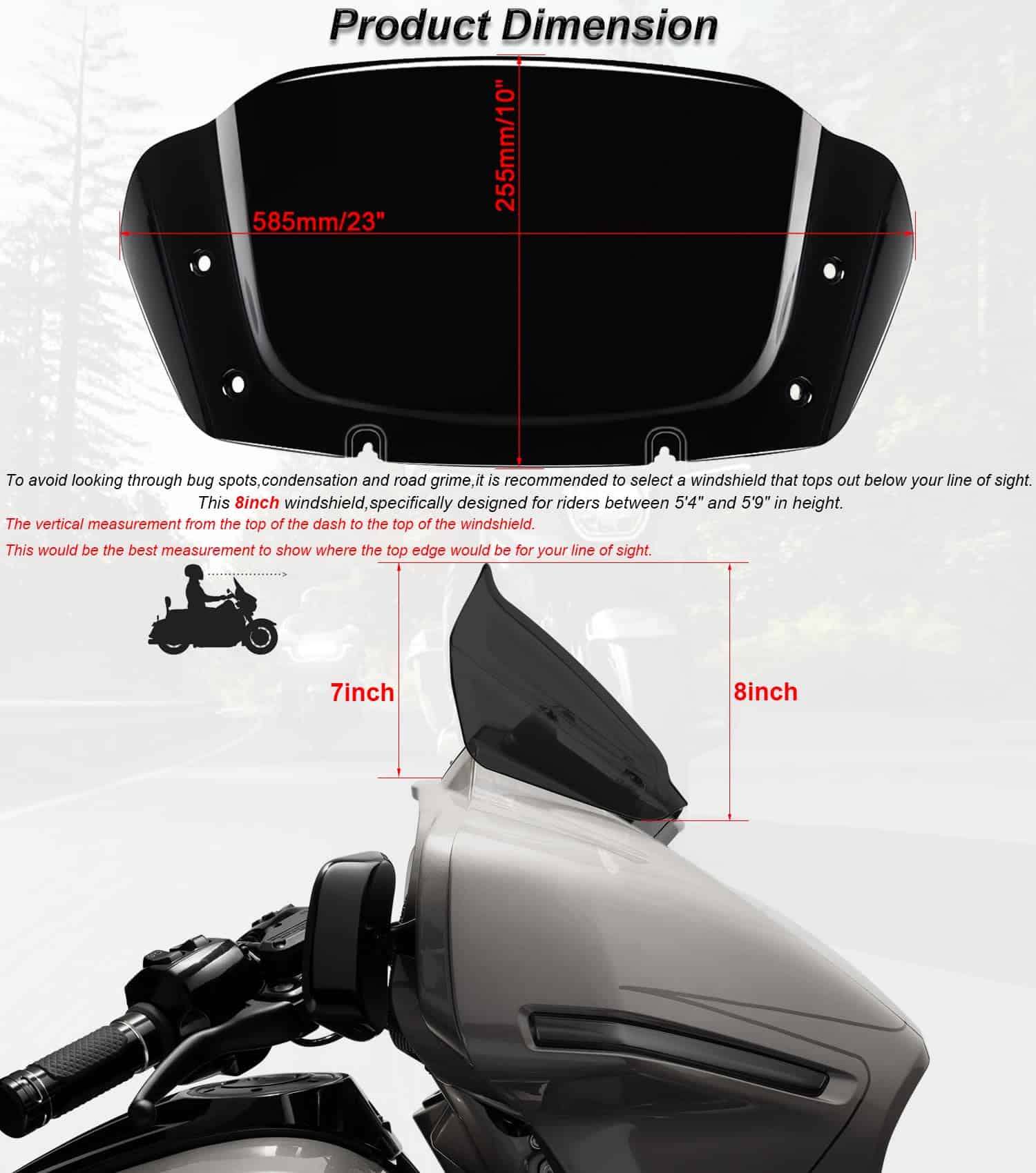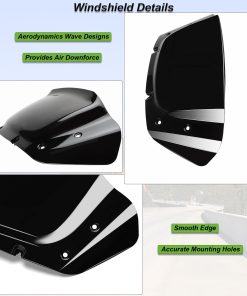 El parabrisas puede proteger a los entusiastas de las motocicletas del viento, las piedras lanzadas, los escombros y los insectos. Viene con un kit de montaje alto y tornillos. Diseñado específicamente para motociclistas con una altura entre 5’4″ y 5’9″. No requiere modificación, agujeros preperforados. Fácil de instalar, no incluye instrucciones de instalación ni tornillos. Tipo de parabrisas: Onda superior diseñada. Material: Policarbonato (PC). Empaque: Un parabrisas.