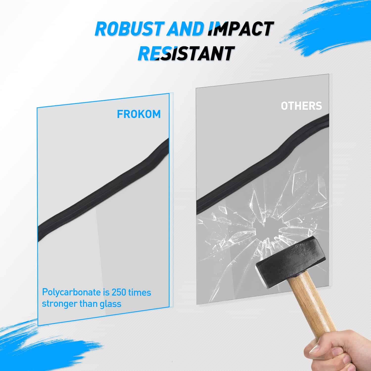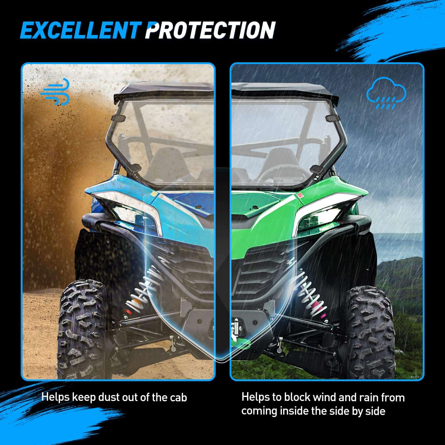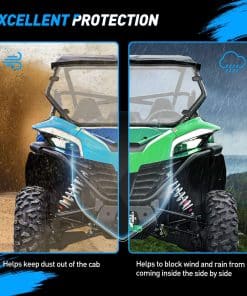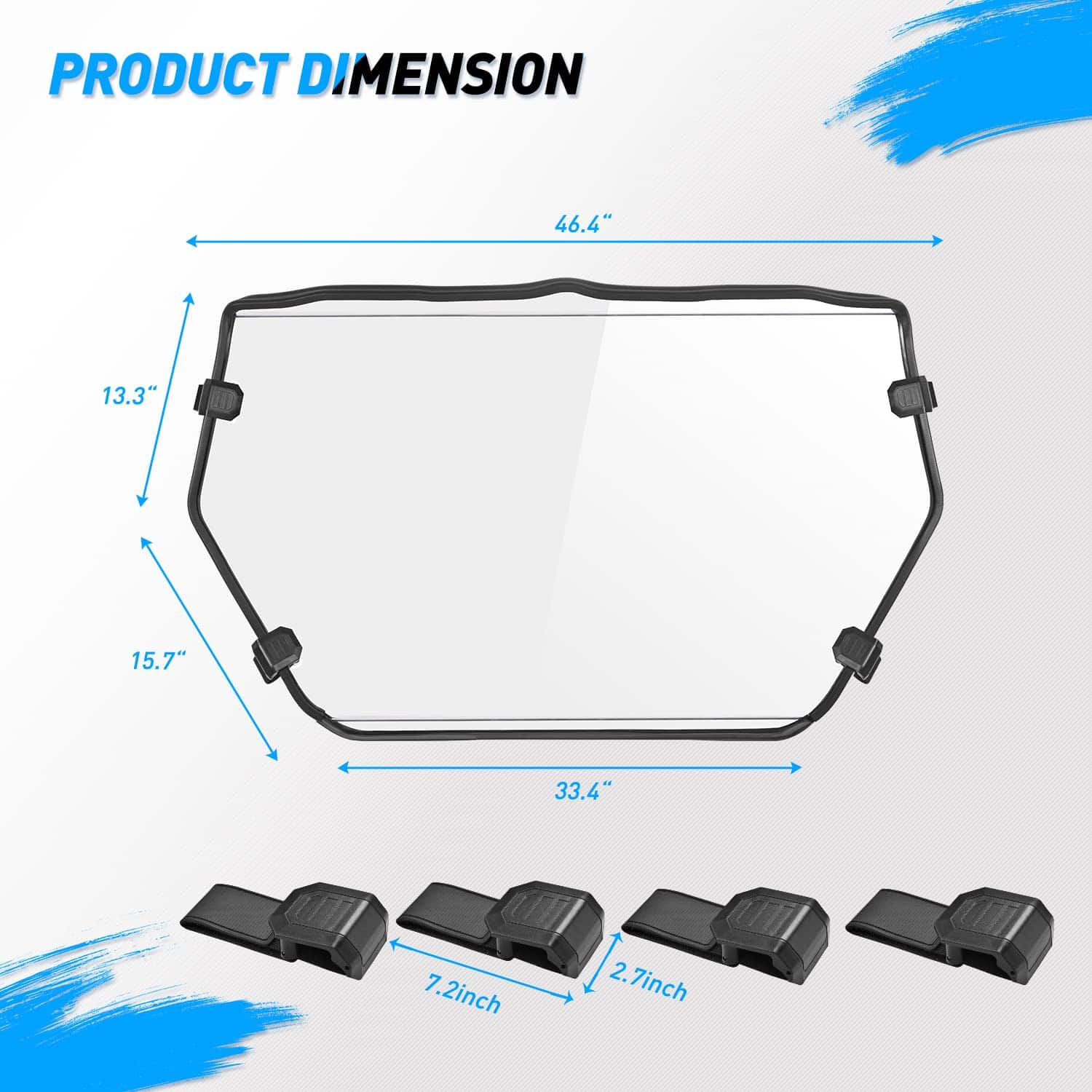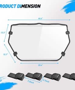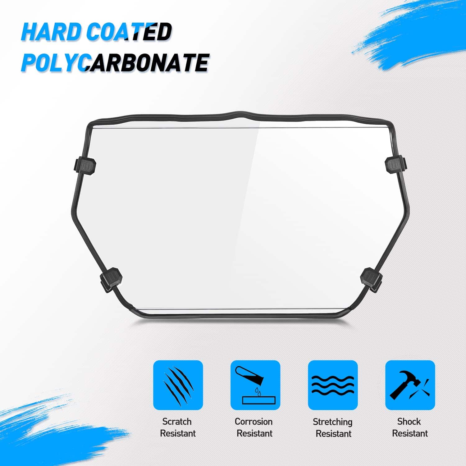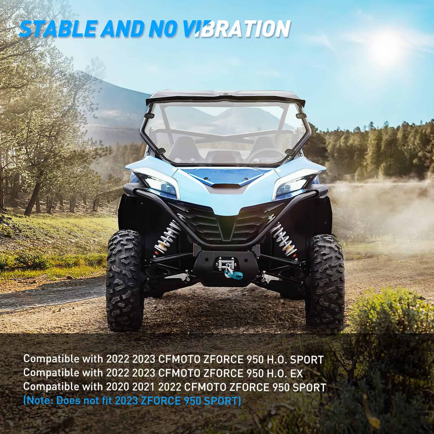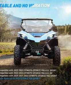Nuestro parabrisas frontal completo Frokom está diseñado específicamente para adaptarse a los modelos CFMOTO ZFORCE 950 H.O. SPORT / 950 H.O. EX 2022-2023 y CFMOTO ZFORCE 950 SPORT 2020-2022. Hecho de materiales de PC de alta calidad, este parabrisas garantiza una transmisión de luz del 95%, suaviza la radiación y le proporciona una visión clara mientras conduce. La construcción de alta calidad con PC endurecido de 1/4 de pulgada de grosor hace que este parabrisas sea resistente a los golpes y 250 veces más fuerte que el vidrio, lo que asegura una durabilidad duradera en diversas condiciones de conducción. Además, la junta de goma del parabrisas protege la cubierta frontal de arañazos y reduce el ruido, lo que contribuye a una experiencia de conducción más placentera. Con este parabrisas, podrá mantenerse abrigado y seco durante todo el año, protegiéndose del viento, las hojas y los escombros mientras disfruta de su viaje en su ZForce 950.