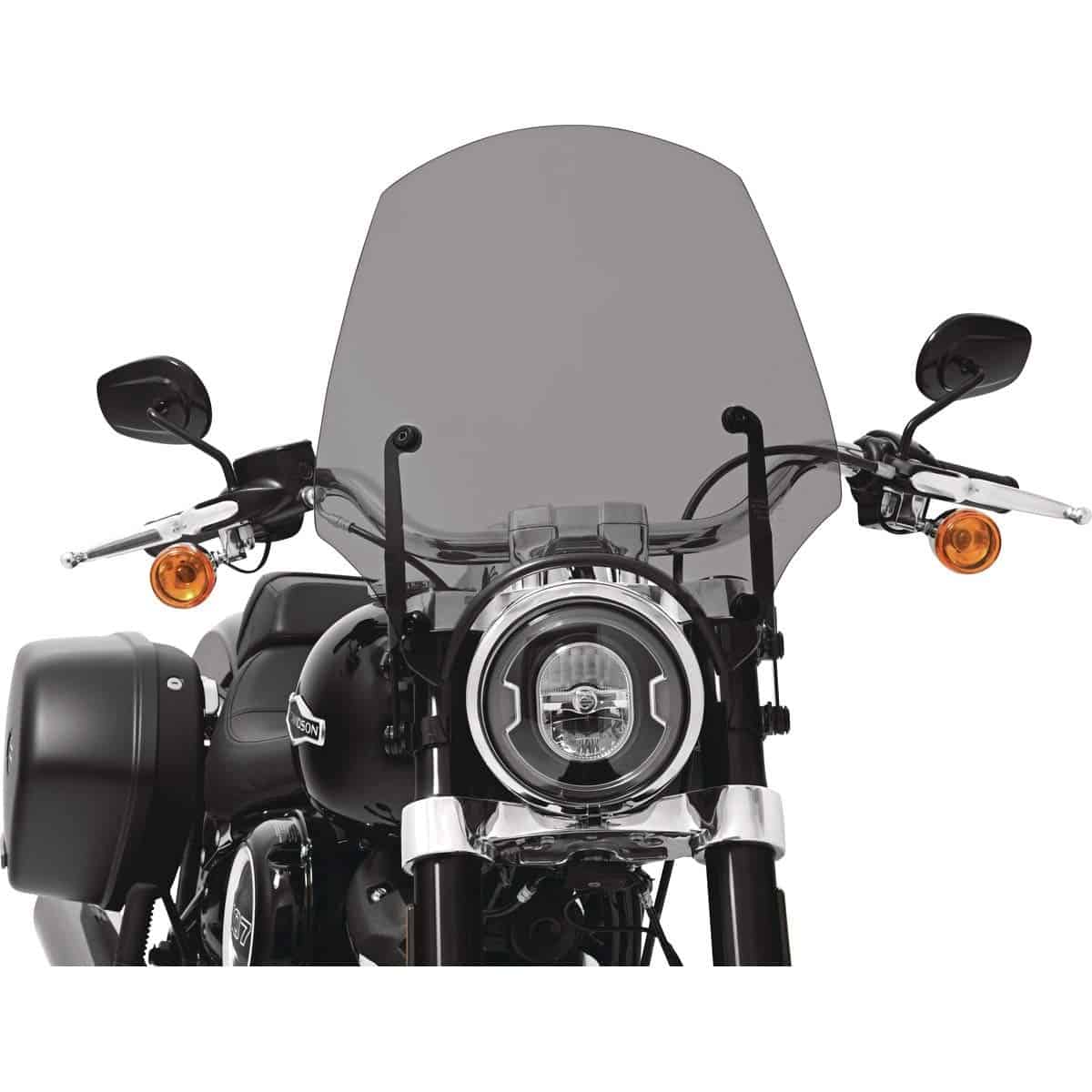 Corte para faros de 9″. Diseño suave que complementa las líneas de tu moto. Parte inferior del parabrisas cónica, ideal para intermitentes montados en el manillar. Fabricado en Lucite para una excelente óptica y durabilidad. Medidas aproximadas: 20″ de ancho y 15″ de alto sobre el faro. Se adapta a la mayoría de los faros redondos. Hardware de montaje desmontable Trigger-Lock sin herramientas debe ser ordenado por separado. Fabricado en los EE.UU.