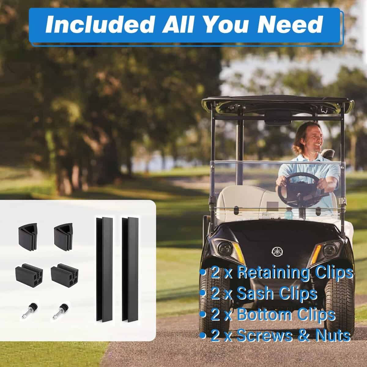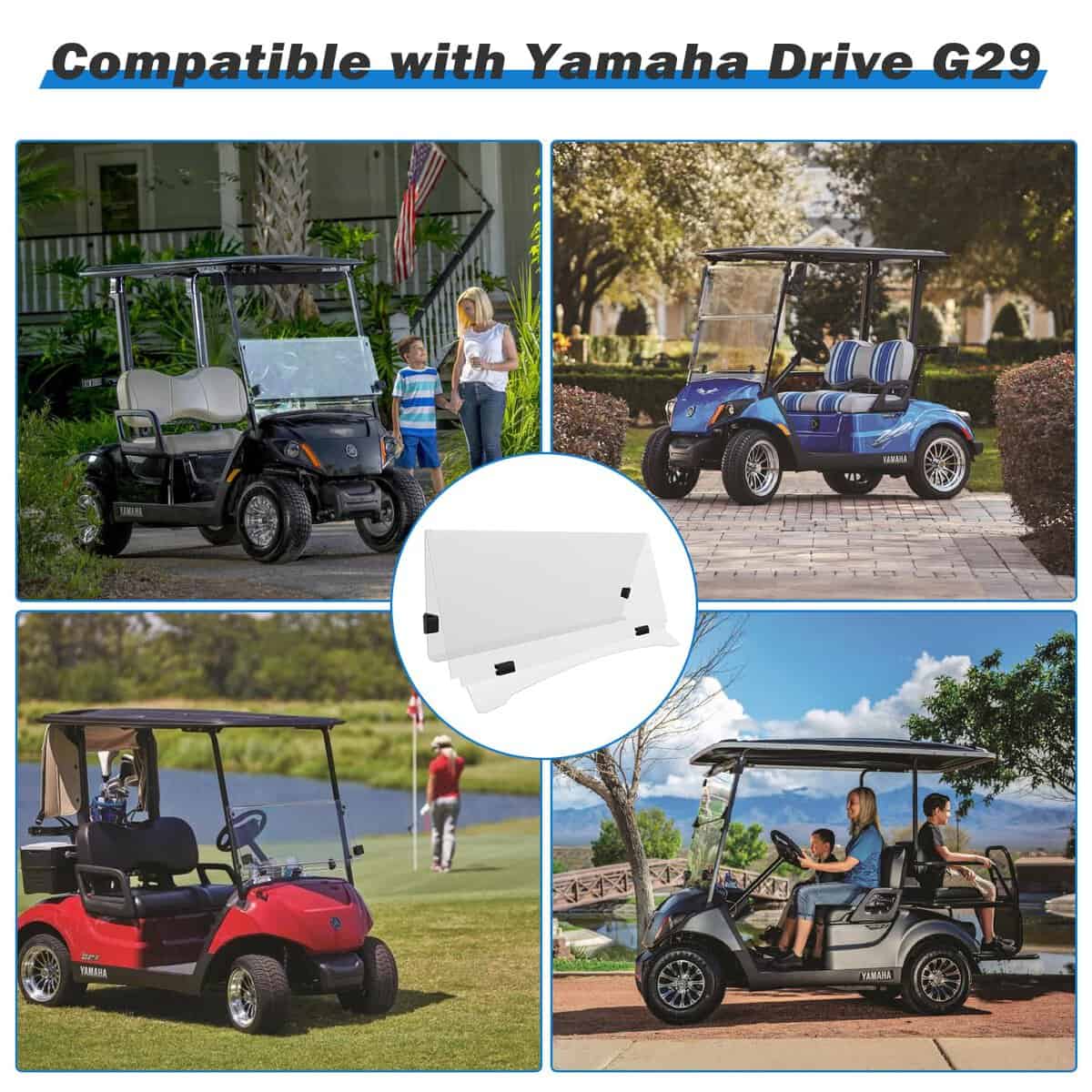 Parabrisas para carrito de golf yamaha drive/G29(2007-2016) que ofrece alta resistencia y protección contra impactos. Este parabrisas claro es perfecto para disfrutar de una vista clara y sin obstrucciones mientras conduces tu carrito de golf. Su diseño plegable te permite adaptarlo a diferentes condiciones climáticas, dejando entrar el viento en los días calurosos y protegiéndote del frío en invierno. El material acrílico de alta calidad garantiza durabilidad y resistencia, evitando que se agriete o dañe con facilidad. La instalación es sencilla y rápida, ya que incluye todo el hardware necesario para un montaje seguro. Disfruta de mayor comodidad y protección con este práctico parabrisas para tu carrito de golf yamaha drive/G29(2007-2016).