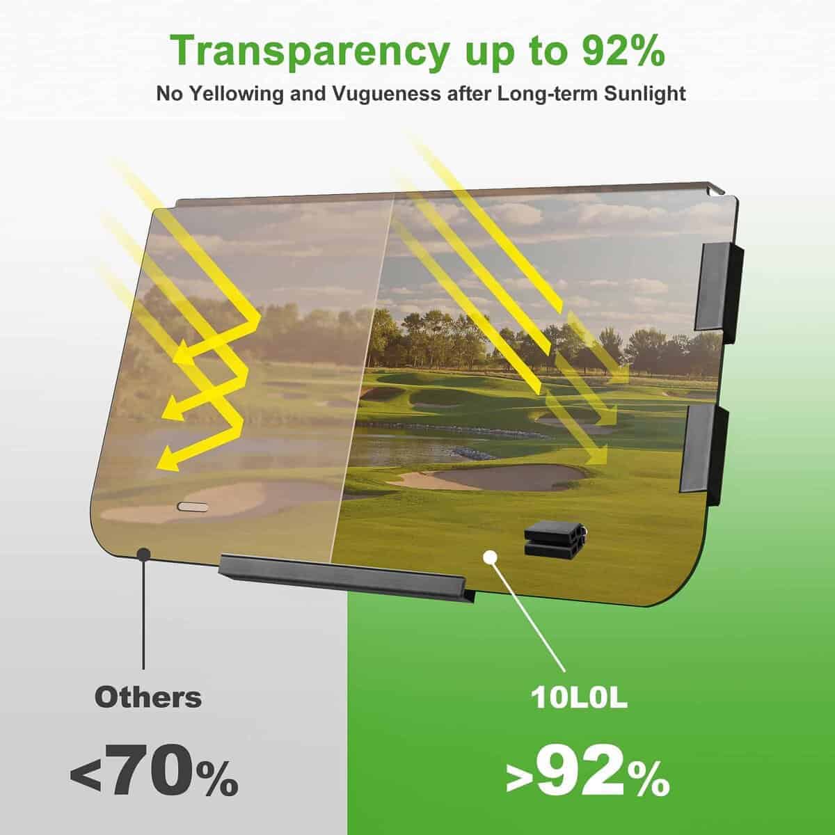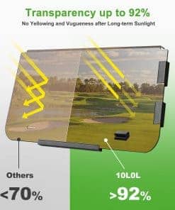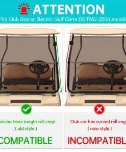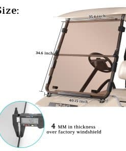 Parabrisas para Carro de Golf 10L0L para Modelos Club Car DS 1982-2000.5, Tintado. Este parabrisas es perfecto para los carros de golf Club Car DS fabricados entre 1982 y 2000.5. Con una dimensión de 39.25″ de ancho y 36.75″ de alto, este parabrisas proporciona una alta transparencia gracias al uso de Policarbonato (PC), que le confiere una transparencia de hasta el 92%. Además, cuenta con una capa UV que evita que se amarillee o se empañe debido a la exposición directa al sol. Su amplio rango de temperatura de trabajo garantiza su resistencia tanto en climas fríos como cálidos, sin que el material se vuelva quebradizo. La instalación es rápida y sencilla, ya que los pivotes vienen preinstalados de fábrica, no se necesitan herramientas adicionales ni se requiere modificar el vehículo.