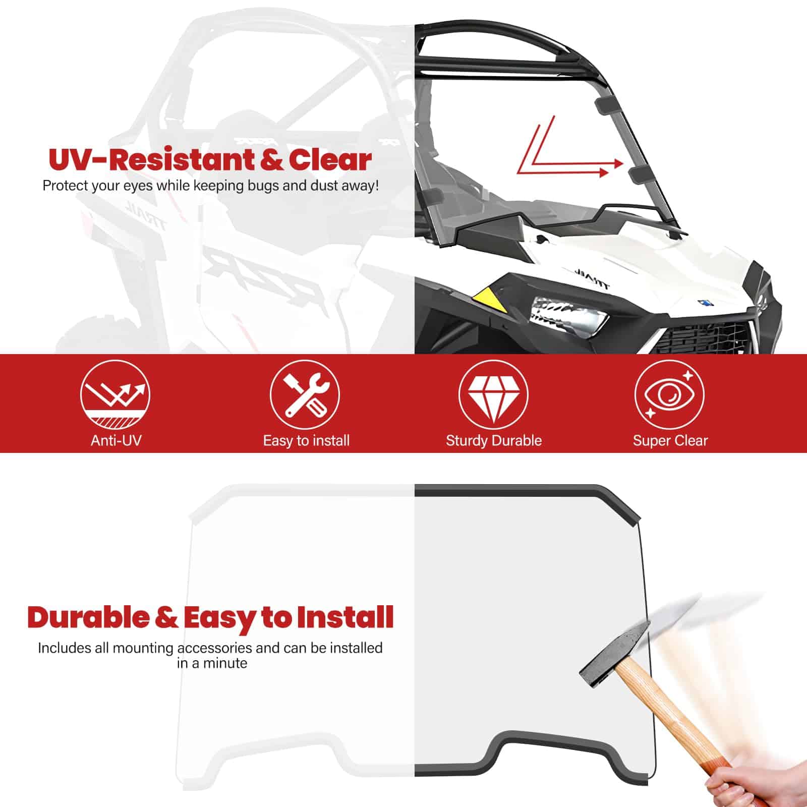 Parabrisas completo compatible con Polaris RZR, resistente y duradero para una experiencia mejorada fuera de la carretera.