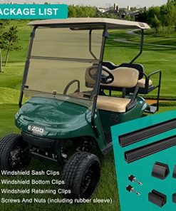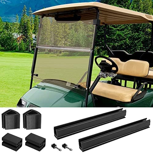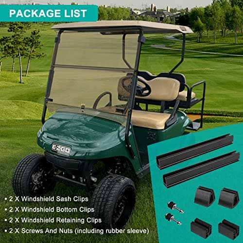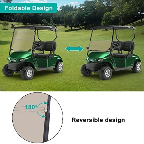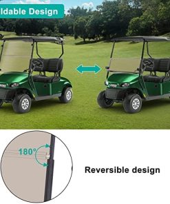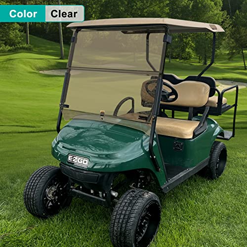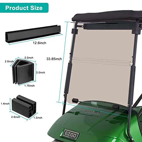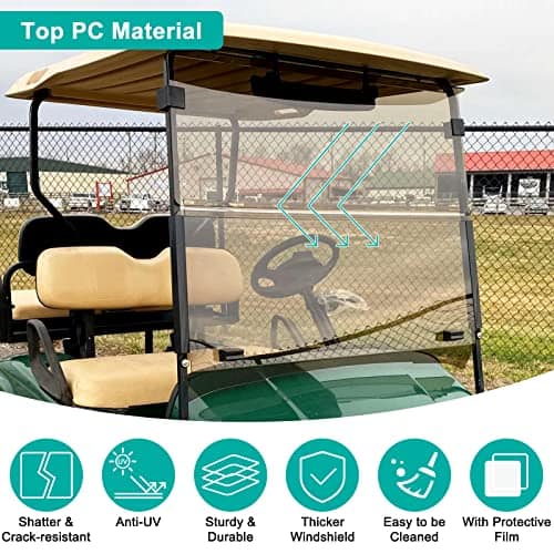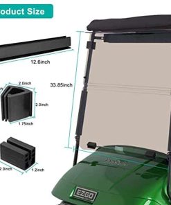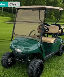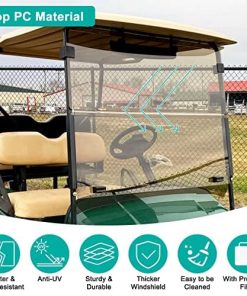 Parabrisas tintado plegable resistente a impactos para carro de golf EZGO TXT años 1995-2013. Este parabrisas tintado plegable está diseñado para adaptarse al carro de golf EZGO TXT de gasolina y eléctrico de los años alrededor de 1995-2013. Fabricado con acrílico de alta claridad para una mejor visibilidad al conducir. Protege al pasajero contra el viento fuerte, gotas de lluvia, polvo, ramitas u otras cosas mientras aumenta la seguridad evitando cerrar los ojos bajo vientos fuertes al conducir al aire libre. Las dimensiones de este parabrisas son de 33.85″ de altura y 40.58″ de ancho en la parte inferior. La instalación es fácil con solo unos pocos pasos, incluye todas las piezas de clip de montaje, no se requiere perforar ni modificar. Se adapta perfectamente al carro. Viene con película protectora en la superficie y los clips ya están instalados. Recuerda quitar la película después de haber concluido la instalación.