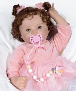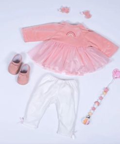 ¡La vida es como un arco iris, vibrante y llena de colores, y Charlotte lo personifica todos los días! Prepárate para llenar tus días de maravillas al dar la bienvenida a esta pequeñita a tu corazón. Sus ojos verdes avellana, mejillas sonrosadas y labios prometen dulces risas. ¡Y oh, sus rizos morenos, adornados con lazos para el pelo rosas en coletas, agregan un toque de encanto a su ya encantadora presencia, lista para una aventura colorida contigo! De pies a cabeza, Charlotte es la representación perfecta de la moda y la ternura. ¡Viste una camisa de terciopelo rosa de manga larga con bordado de arco iris y una falda de tul de punto para un giro divertido y caprichoso! Completando su conjunto se encuentran leggings de punto jersey blanco, botas de gamuza falsa rosa, un pañal y su preciado chupete rosa. El clip de chupete de arco iris rosa mantiene su chupete cerca, asegurándose de que siempre se sienta segura. Dos lazos para el pelo de terciopelo rosa a juego agregan el toque final a sus hermosos mechones, ¡haciéndola el arco iris perfecto en tus brazos!