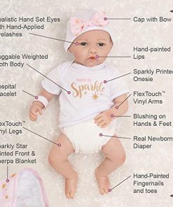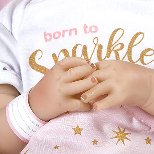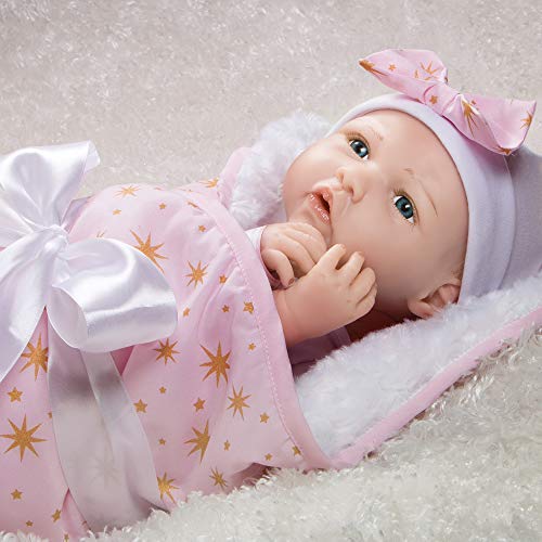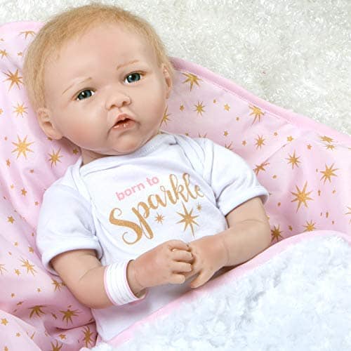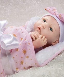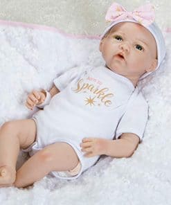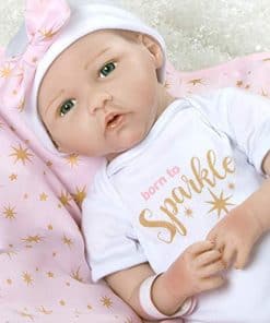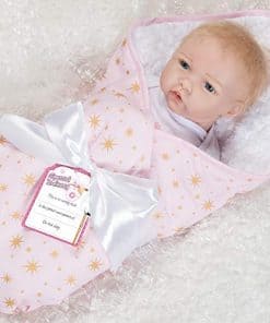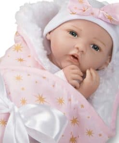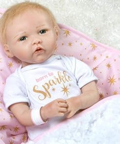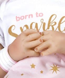 Born to Sparkle está lista para estar en el centro de atención y en el foco de atención! Esta rubia brilla con rasgos delicados y ojos azules brillantes. Su cabeza, brazos y piernas están hechos del innovador vinilo FlexTouch mezclado con silicona que se siente maravillosamente suave y tan realista, ¡como una verdadera bebé renacida! Su cuerpo es de tela y con peso para sentirse como un bebé real. Te encantará pasar tus dedos por la cabeza de esta niña pequeña con cabello rubio claro aplicado a mano mientras miras fijamente sus brillantes ojos de teléfono con pestañas aplicadas a mano. Esta muñeca realista también presenta uñas pintadas a mano, tanto de los dedos como de los pies, y labios. Está envuelta apretada en una manta rosa con diseño de estrellas doradas y un forro blanco de piel sintética. «Born to Sparkle» está impreso en su body de algodón blanco y captura perfectamente su personalidad vibrante. Llega con una etiqueta de regalo de Entrega Especial, pulsera de hospital auténtica, certificado de nacimiento e incluso un pañal real! Born to Sparkle de Jannie de Lange es parte de la preciada colección de Paquetes de Bebés de Paradise Galleries, un grupo de 7 muñecos ultrarrealistas que se asemejan a verdaderos bebés recién nacidos. Cada Paquete de Bebé está hecho a mano en vinilo FlexTouch mezclado con silicona increíblemente realista, con cabello falso y detalles pintados a mano. Esta tecnología FlexTouch la hace sentirse como una muñeca de silicona. Cada paquete de recién nacidos está vestido con un body de algodón blanco con un dicho temático impreso en el pecho, y una gorra linda. Estas nuevas llegadas también vienen con una manta suave y acolchada atada con un lazo, etiqueta de regalo, pulsera de hospital personalizable, certificado de nacimiento y pañal. Todos los Paquetes de Bebés también vienen en una Caja de Coleccionistas y un Certificado de Autenticidad firmado con la firma del artista.