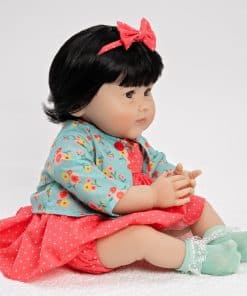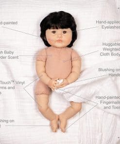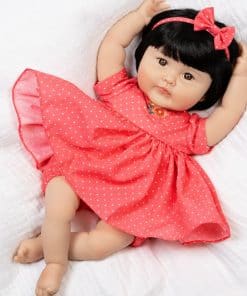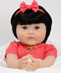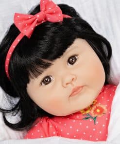 Viene con un chupete magnético Artista: Ping Lau Tamaño: 20″ de cabeza a pies Material: Vinilo SoftTouch Scent de polvo de bebé ligero 3/4 brazos y piernas Ojos marrones Viene con un vestido de lunares coral y blanco con bombachos y diadema de lazo, suéter floral verde menta y calcetines con delicados volantes de encaje blanco. Llega con el nuevo y mejorado cuerpo de tela de PG Peluca con cabello de nylon negro sedoso Libre de BPA Destinado a colectores de muñecas renacidas a partir de los 3 años Nuestra hermosa niña japonesa Kayo Hana, cuyo nombre se traduce como Flor Hermosa en japonés, nos deleita con su belleza. Con la combinación más impresionante de colores en su conjunto, esta preciosidad florece con amor mientras la acurrucas dulcemente en tus brazos. Nuestra impresionante niña asiática realista Kayo Hana está vestida con un vestido coral de lunares bordado con apliques de flores en el corpiño y bombachos a juego. Cuando tiene frío vagando por el jardín, esta muñeca realista puede llevar su delicado suéter verde menta con estampado de flores para cubrir sus brazos de vinilo suave al tacto. Los calcetines verde menta con ribetes de encaje blanco cubren sus deditos de bebé. También llega con una diadema de lazo para peinar su cabello negro sedoso. Kayo Hana es un rediseño de nuestra muñeca asiática Chilly Lily, esculpida con amor por la reconocida artista de renombre mundial Ping Lau. Esta muñeca realista tiene 20 pulgadas de tamaño y está elaborada con nuestro vinilo SoftTouch premium que le da un delicioso aroma a polvo de bebé y una sensación realista. Con este vinilo, Kayo Hana tiene características increíblemente realistas, incluyendo pliegues y rollitos de bebé. Llega en nuestra nueva Caja de Coleccionista ecológica junto con un Certificado de Autenticidad numerado con la firma del artista. Esta muñeca niña similar a un bebé renacido es adecuada para coleccionistas de muñecas renacidas a partir de los 3 años. ¡Explora nuestra colección de accesorios para muñecas renacidas, incluyendo nuestros populares Pañales para Muñecas Reborn y las Botellas Mágicas para Bebés preferidas por nuestros clientes! Nuestros do