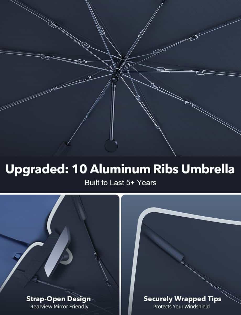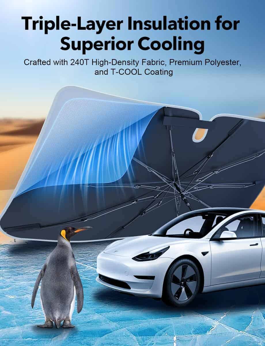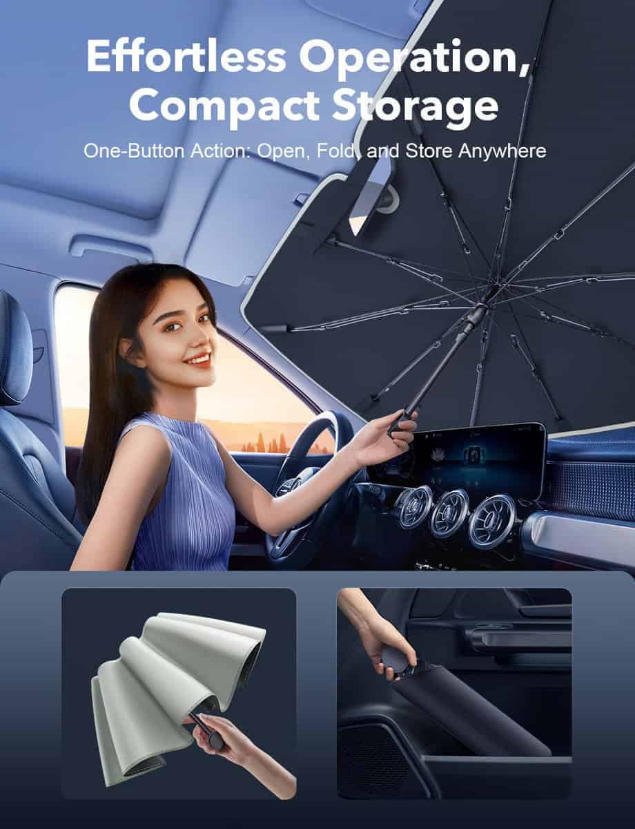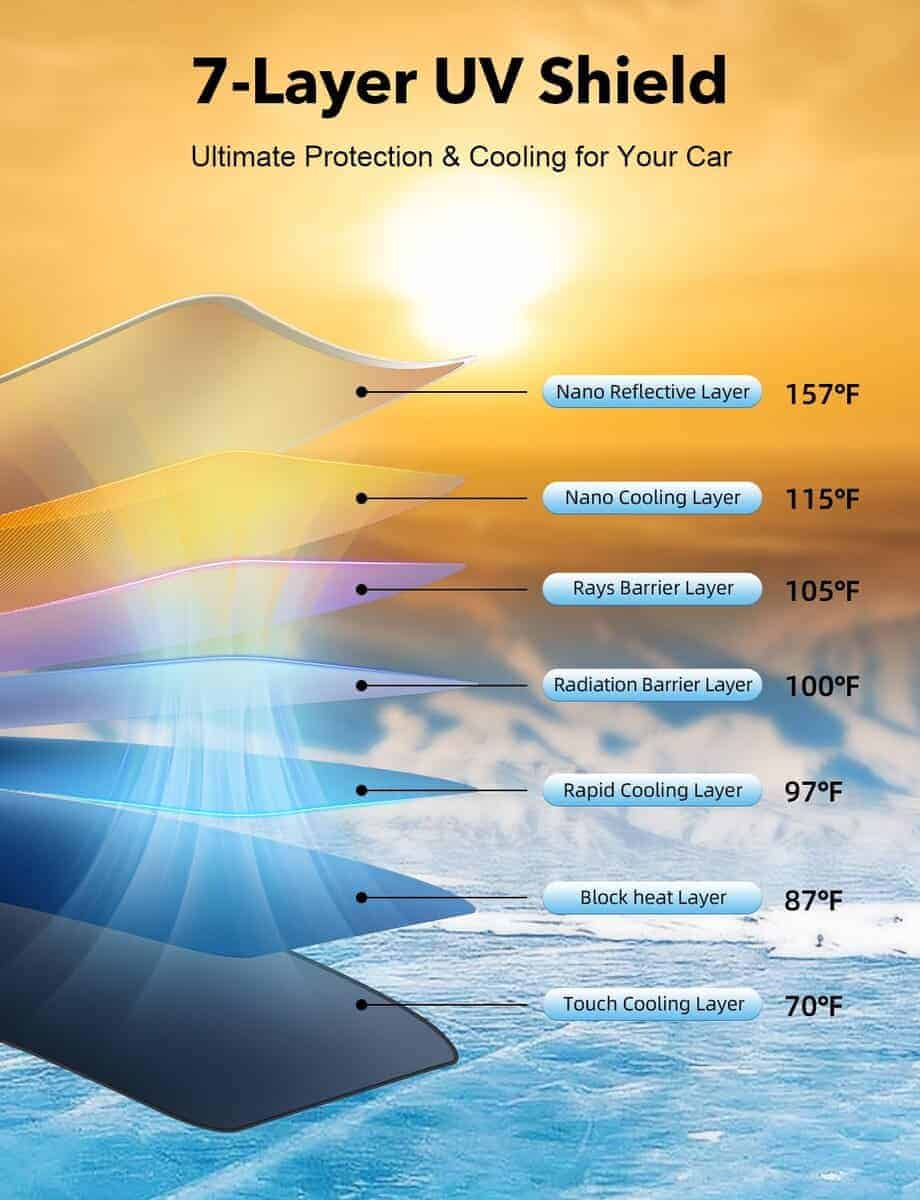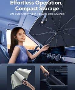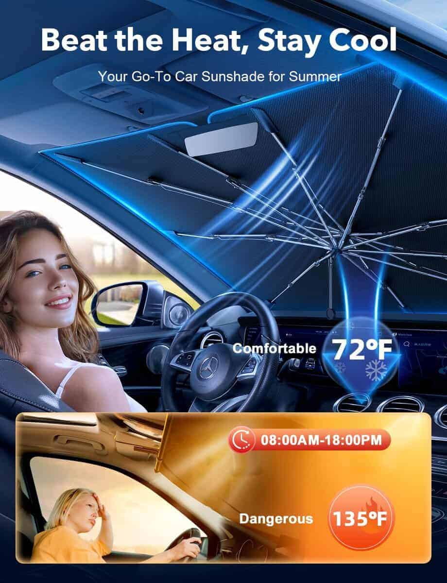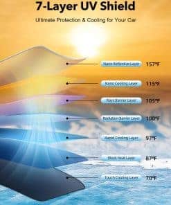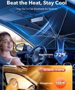 3. Viajes más frescos, jornadas más felices: Esencial para cualquier viaje o estacionamiento al aire libre, nuestra sombrilla para automóvil mejorada para 2025 cuenta con un diseño de doble capa con tela de alta densidad 240T y un revestimiento reflectante de alta temperatura. Esta construcción premium ofrece un aislamiento excepcional contra el calor y los rayos UV del sol, reduciendo potencialmente las temperaturas interiores en hasta 100 F, creando una experiencia de conducción más agradable a 68-75 F.