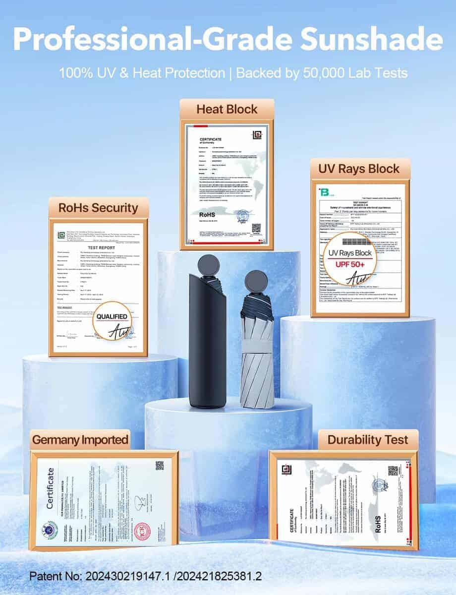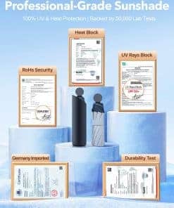 1. Calidad de clase mundial certificada: Con 35 patentes y certificaciones, nuestra calidad habla por sí misma. Más allá de los materiales convencionales recubiertos de plata, la sombrilla de parabrisas para automóvil ROWJOWL introduce un innovador tejido de alta densidad 240T con un revestimiento reflectante de fibra de poliéster. Esta combinación revolucionaria no solo bloquea la luz solar dañina y los rayos UV, sino que también ofrece aislamiento de doble capa para una durabilidad incomparable. Suficientemente versátil como para funcionar como un paraguas de emergencia, es su aliado todo clima.