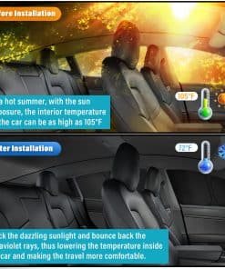 4. Diseño Excelente: El diseño preciso de ajuste y el anillo de acero reforzado son suficientes para hacer que el parasol se ajuste con precisión al ventanilla del Tesla Model Y sin necesidad de ventosas para fijarlo en su lugar. No se caerá ni colgará como otros escudos térmicos para coches. Además, es liviano y puede soportar un uso repetido (nota: el lado plateado está hacia afuera, mientras que el lado negro está hacia adentro).