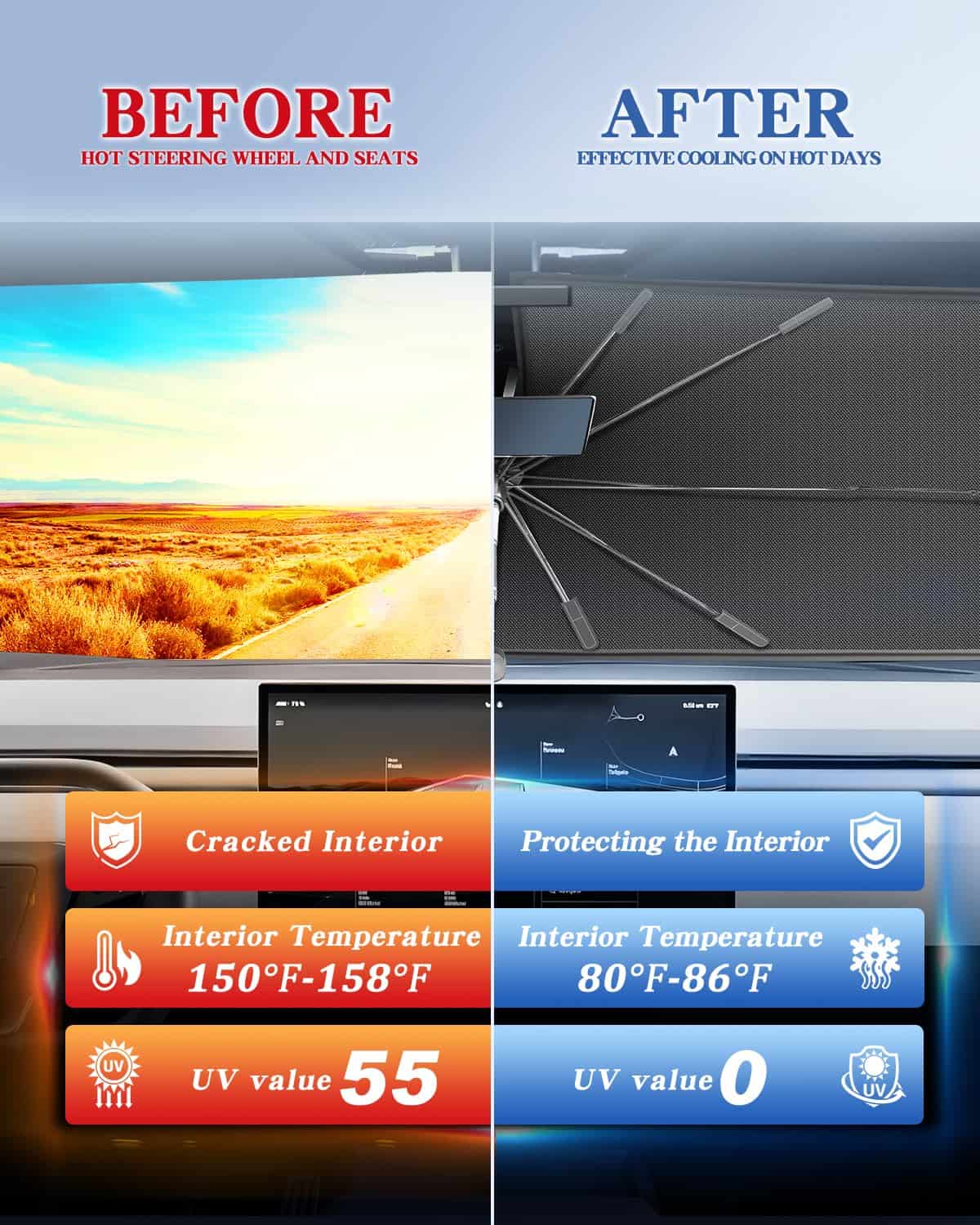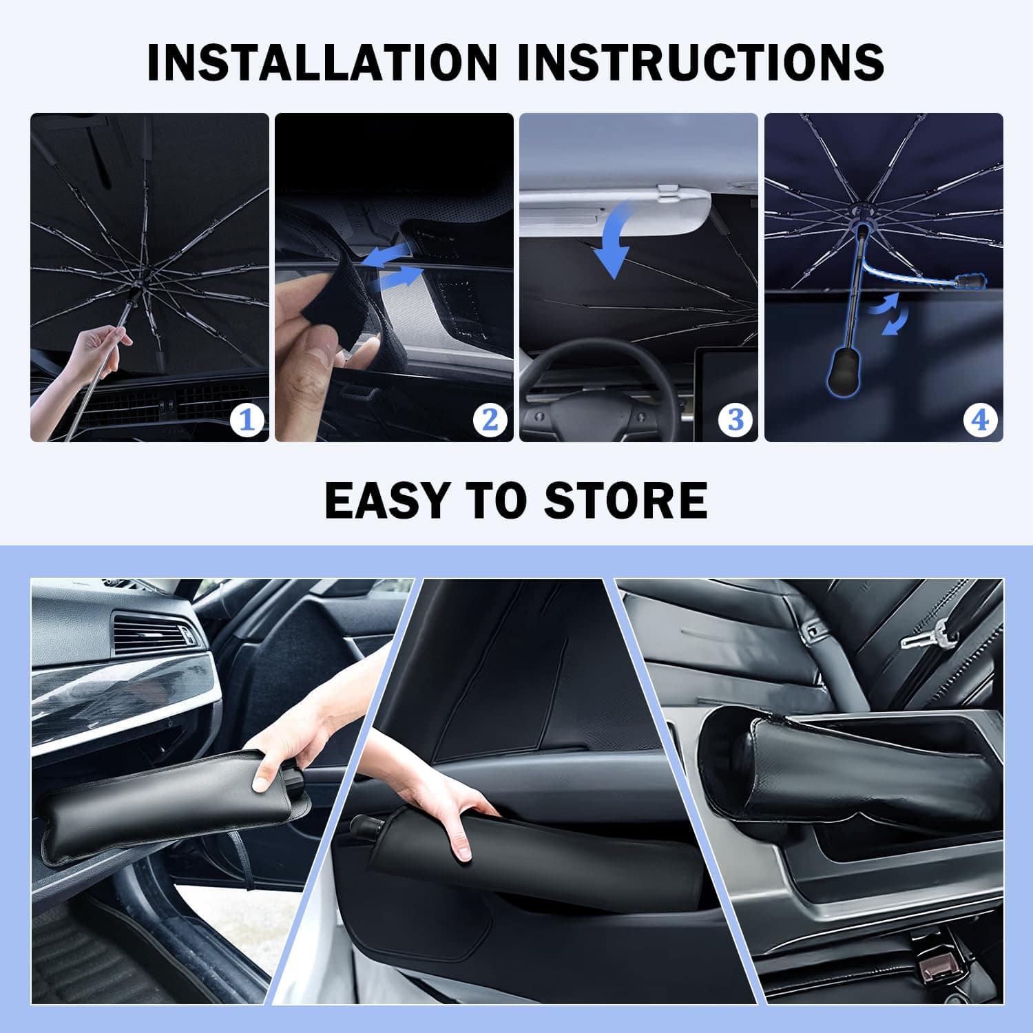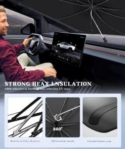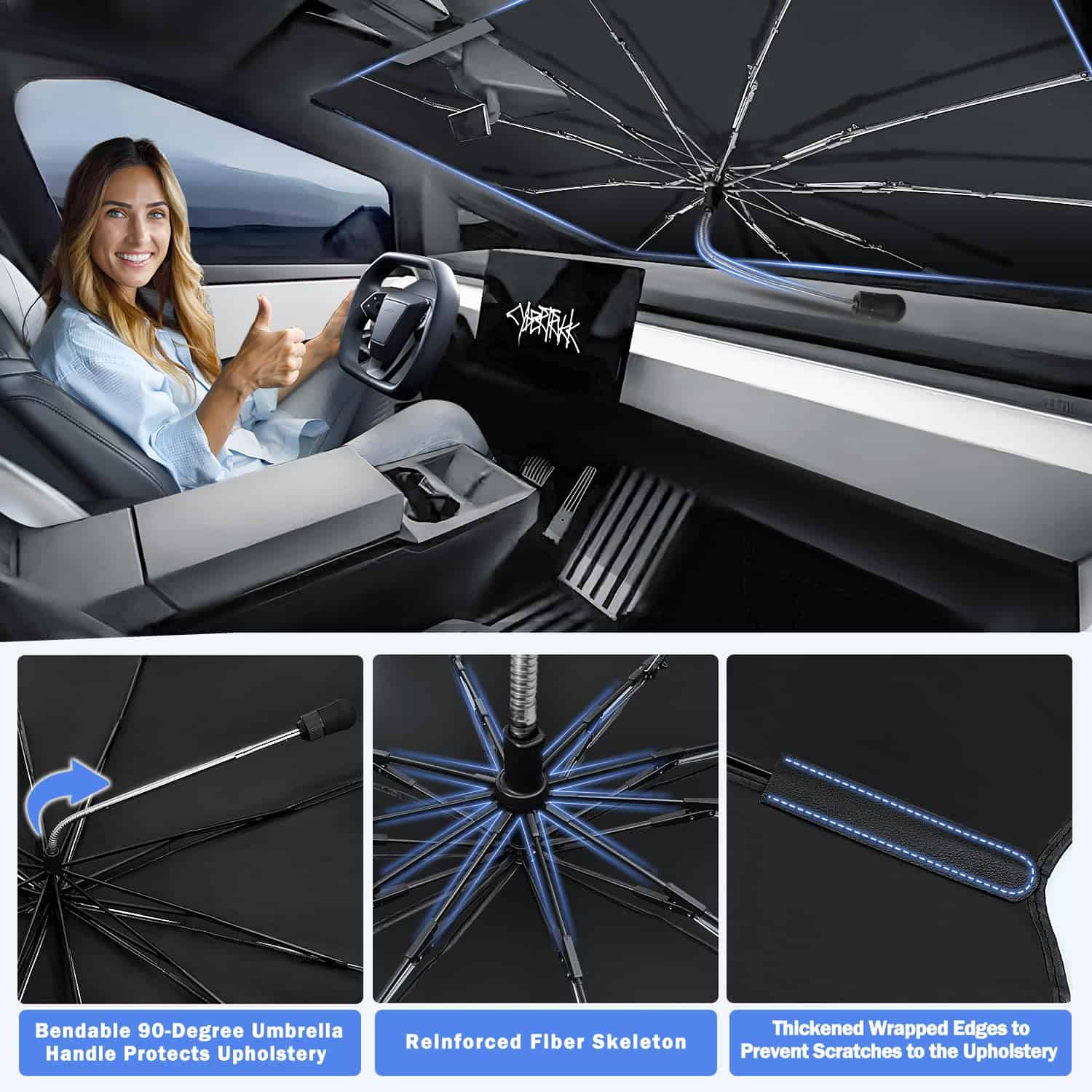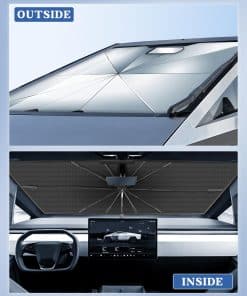 Parasol a medida para Tesla Cybertruck 2024. Diseño de paraguas plegable único que garantiza una cobertura completa del parabrisas para evitar la filtración de luz. El mango del paraguas flexible a 90 grados protege el tapizado y el esqueleto de fibra reforzado se puede doblar sin romperse. La punta del paraguas está engrosada y alargada para evitar arañazos en el tapizado y el parabrisas. El revestimiento de bloqueo UV de titanio plateado de 6 capas reduce la temperatura interna del automóvil y protege el tablero, los asientos y otros componentes interiores de los daños causados por el sol. Fácil de instalar y quitar, con bolsa de almacenamiento incluida. Fabricado con materiales premium para garantizar durabilidad y rendimiento a largo plazo. Contacta con nosotros si tienes alguna pregunta o inquietud.
