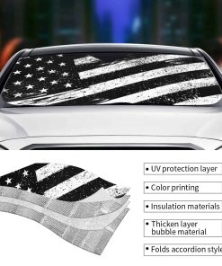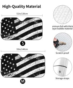 Mantén tu vehículo fresco y protegido del sol con este parasol con un diseño vintage de la bandera de los Estados Unidos. Fabricado con materiales de alta calidad, este parasol bloquea los dañinos rayos UV, protegiendo el interior de tu automóvil, camión o SUV. Con un tamaño de 51.2×27.5 pulgadas, se adapta a la mayoría de los parabrisas delanteros. Además de proporcionar protección solar, este parasol también agrega un toque patriótico a tu vehículo. ¡Consíguelo ahora y mantén tu vehículo fresco y protegido!