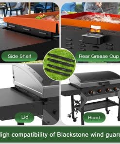 ALTA COMPATIBILIDAD: Este paravientos Blackstone está especialmente diseñado para 22″ parrilla Blackstone, se adapta a la mayoría de los modelos de parrilla Blackstone de 22 pulgadas 1666/1813/1833/1842/1891/1935/1940/2015/2061/2063 y otras marcas de parrilla. Además, es compatible con la bandeja de grasa trasera, estante lateral, cubierta y capucha.