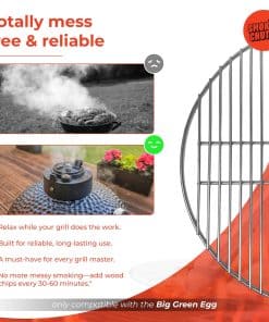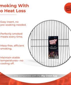 Parrilla de Acero Inoxidable diseñada para funcionar con el Sistema Smokin’ Chute. Se adapta a Big Green X-Large y otras parrillas de 24” de diámetro