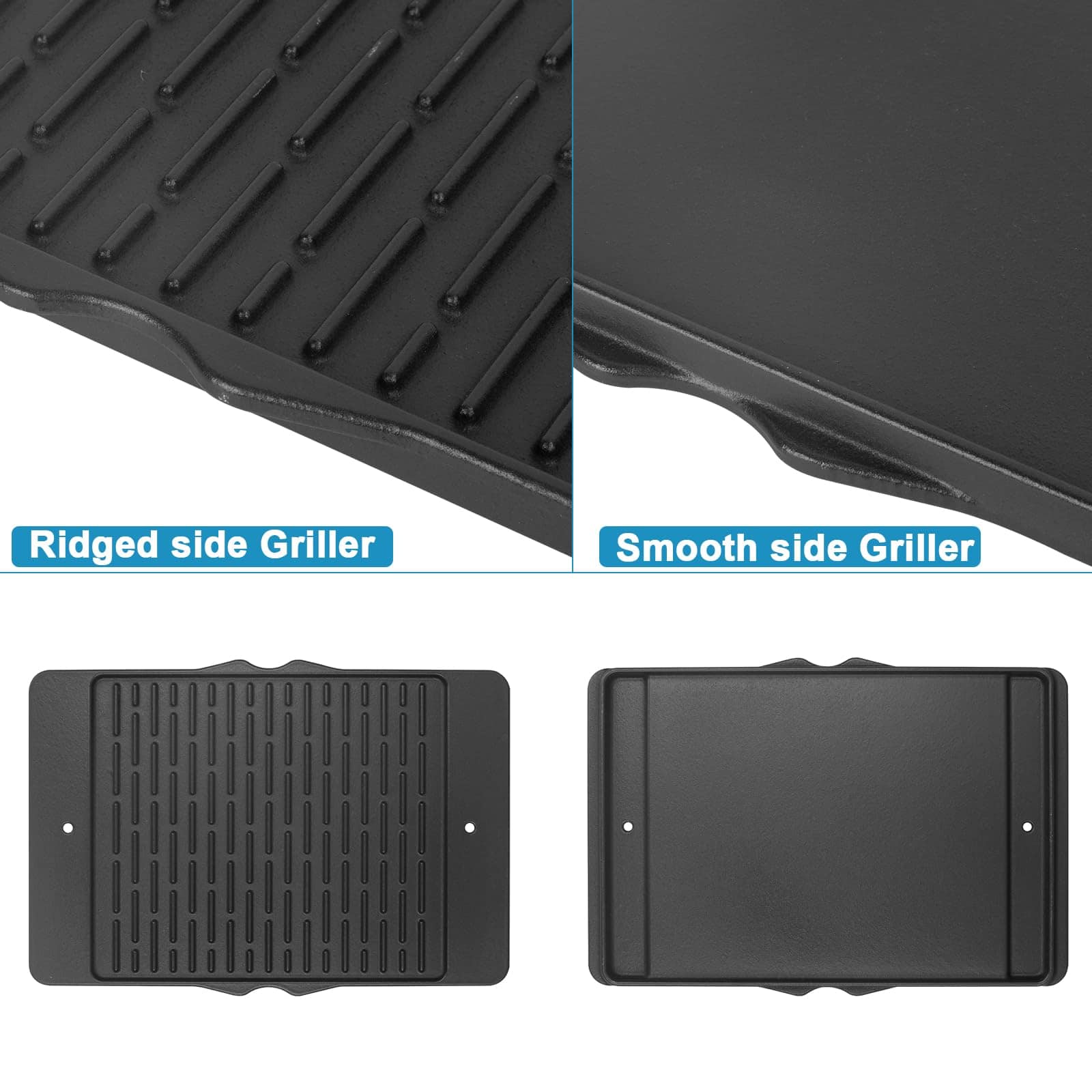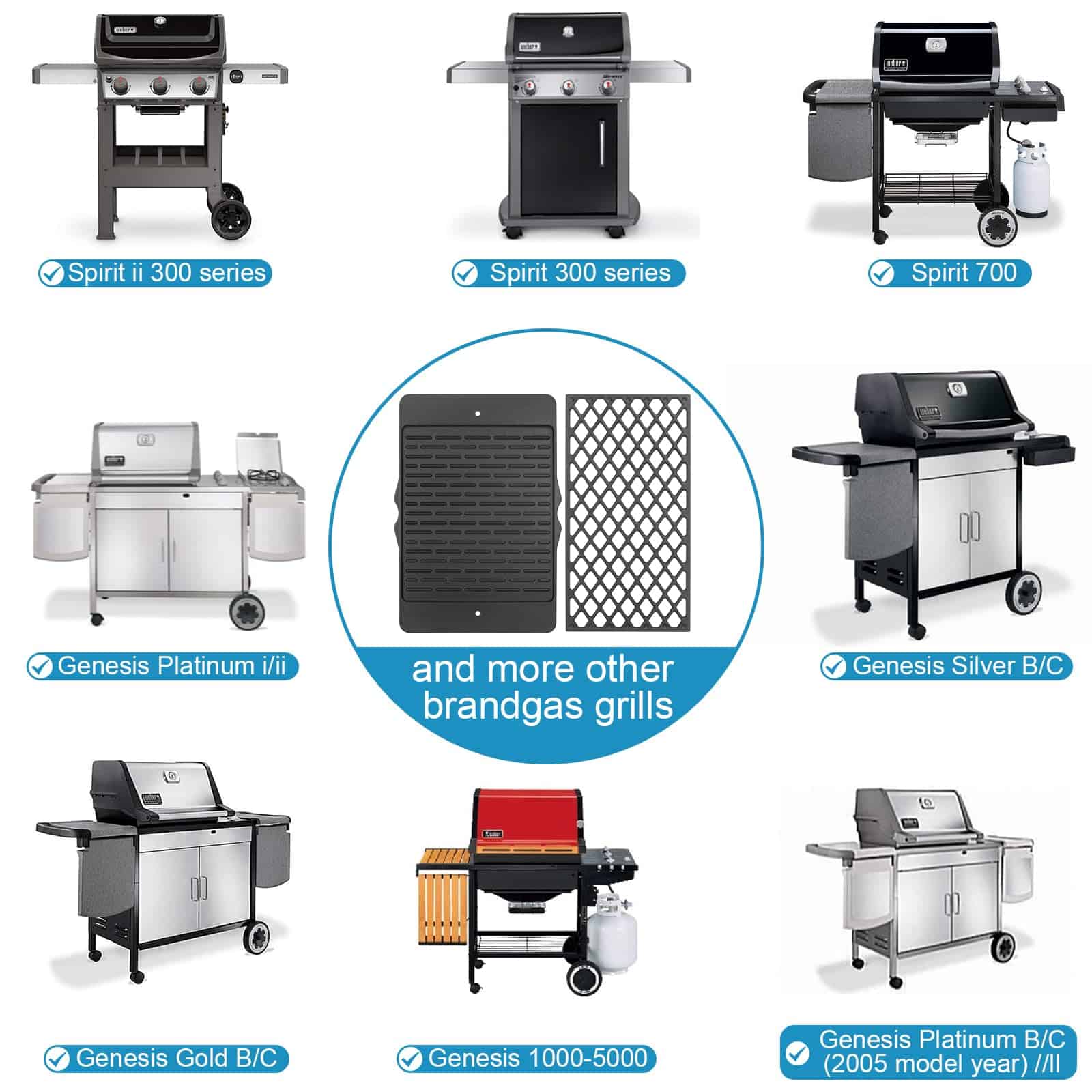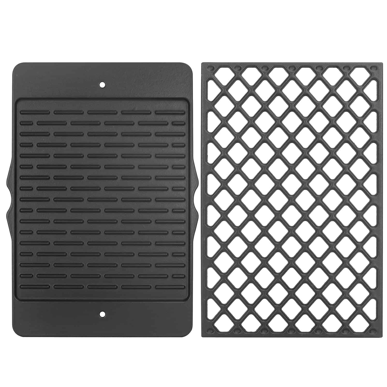 Parrilla de hierro fundido duradero recubierta de esmalte para evitar la oxidación y durar más. Una parrilla de hierro fundido de doble cara te permite hacer panqueques, huevos y tocino en el lado liso, y pescado delicado y verduras en el lado texturizado. Ambos lados distribuyen el calor de manera más uniforme, se calientan más rápido y retienen el calor por más tiempo. Paquete incluye 1 parrilla de hierro fundido esmaltada mate de doble cara y 1 parrilla de parrilla. Dimensiones: 17.5 x 12 x 0.62 pulgadas cada una. Compatible con las parrillas Weber Spirit 300 y Spirit II 300 Series, así como con los modelos Weber Genesis Silver, Gold, Platinum, Broil King y Broil-Mate. Perfecto como repuesto para varios modelos de parrillas Weber.