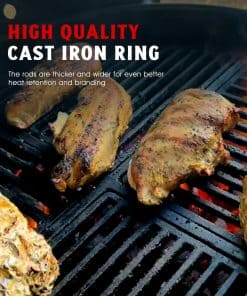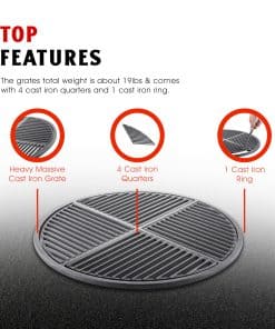 Parrilla de Hierro Fundido Modular Pre-Seasoned Craycort, se Adapta a Parrillas de Carbón de 22.5″ como Weber y SnS Grills – Parrilla Pesada de 19 lb para una Retención de Calor Superior y una Cocina Versátil. Diseñada específicamente para adaptarse a parrillas de carbón de 22.5″ como Weber Gold and Silver, así como modelos de SnS Grills, Recteq, Outdoorchef, Masterbuilt y Napoleon. El diámetro de 21.4 pulgadas garantiza un ajuste exacto para un rendimiento de parrilla mejorado. Esta parrilla de hierro fundido cuenta con un sistema modular con 4 cuartos de hierro fundido y 1 anillo de hierro fundido. Para una flexibilidad de cocina máxima, puede personalizar su configuración de parrilla intercambiando secciones con accesorios opcionales como una plancha, piedra para pizza, wok para verduras o asiento para pollo. Con un peso de 19 libras, esta parrilla de hierro fundido concentra y retiene el calor de manera excepcional, garantizando un sellado óptimo y una distribución de calor uniforme en toda la parrilla. Usarás menos combustible mientras logras marcas de sellado perfectas en bistecs, hamburguesas y más. Pre-condimentada con aceite de soja, esta parrilla proporciona una superficie naturalmente antiadherente, evitando que los alimentos se peguen y facilitando la limpieza. Límpiala con un paño y enciende tu parrilla para obtener resultados instantáneos. Hecho de hierro fundido de alta resistencia, esta parrilla está diseñada para resistir el calor intenso, los elementos exteriores y las parrillas frecuentes. Con el cuidado adecuado, puede durar muchos años o incluso décadas, ofreciendo un excelente valor a largo plazo.